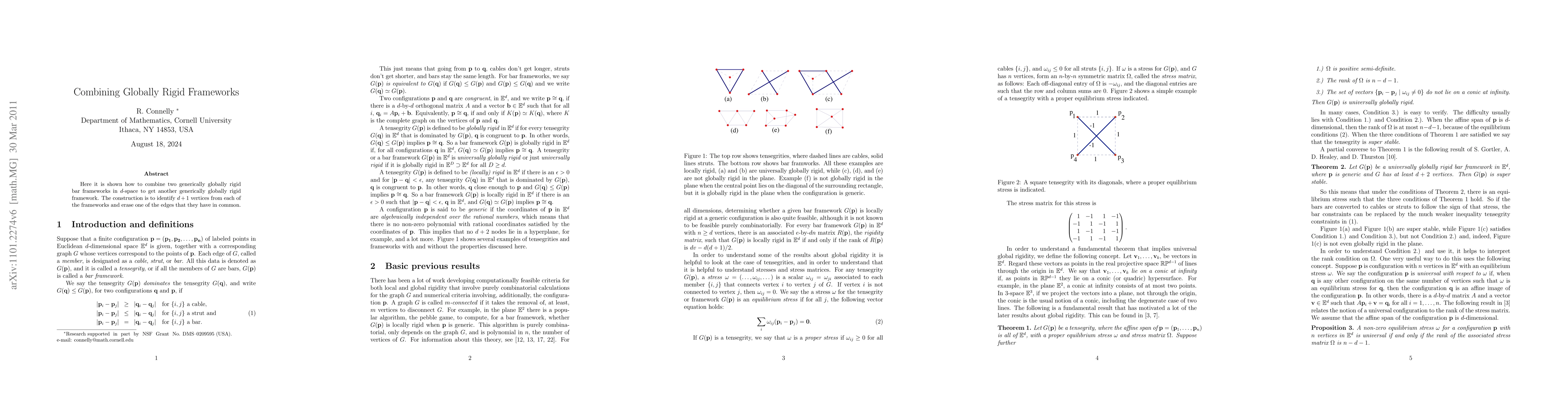 Here it is shown how to combine two generically globally rigid bar frameworks in $d$-space to get another generically globally rigid framework. The construction is to identify $d+1$ vertices from each of the frameworks and erase one of the edges that they have in common.
