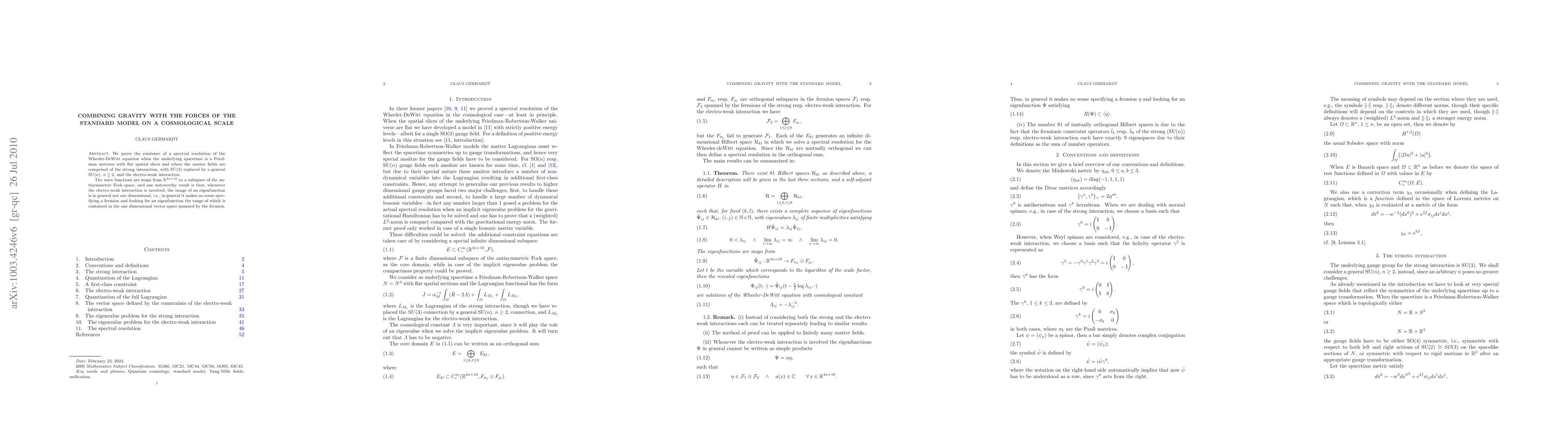 We prove the existence of a spectral resolution of the Wheeler-DeWitt equation when the underlying spacetime is a Friedman universe with flat spatial slices and where the matter fields are comprised of the strong interaction, with $\SU(3)$ replaced by a general $\SU(n)$, $n\ge 2$, and the electro-weak interaction. The wave functions are maps from $\R[4n+10]$ to a subspace of the antisymmetric Fock space, and one noteworthy result is that, whenever the electro-weak interaction is involved, the image of an eigenfunction is in general not one dimensional, i.e., in general it makes no sense specifying a fermion and looking for an eigenfunction the range of which is contained in the one dimensional vector space spanned by the fermion.