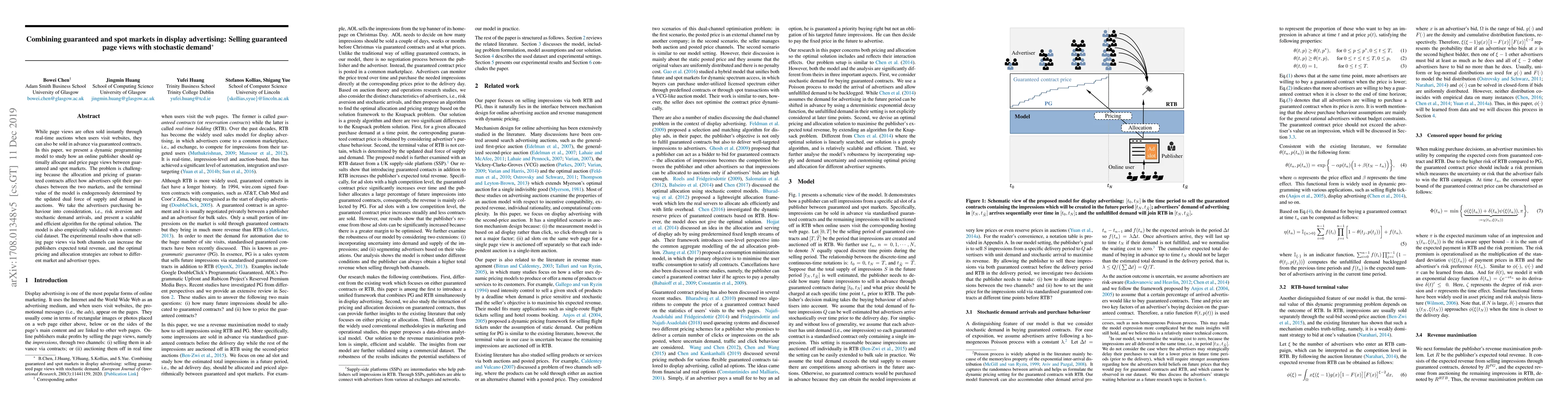 This paper develops a dynamic programming model to optimize the allocation and pricing of page views between guaranteed contracts and real-time auctions in display advertising, considering advertisers' risk aversion and stochastic demand. Empirical validation shows that combining both markets can boost publisher revenue, with the proposed strategies proving robust across various market and advertiser conditions.