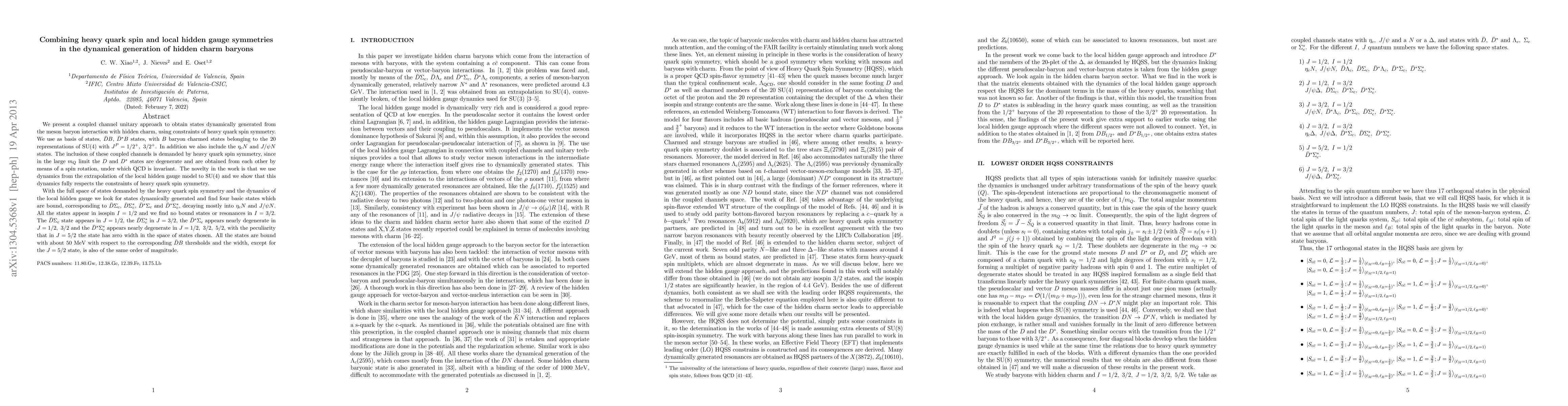 This paper combines heavy quark spin symmetry and local hidden gauge symmetries to dynamically generate hidden charm baryons using a coupled channel unitary approach. It finds four bound states, $\bar D \Sigma_c$, $\bar D \Sigma_c^*$, $\bar D^* \Sigma_c$, and $\bar D^* \Sigma_c^*$, with masses around 50 MeV below their respective thresholds, and confirms the symmetry constraints of the model.