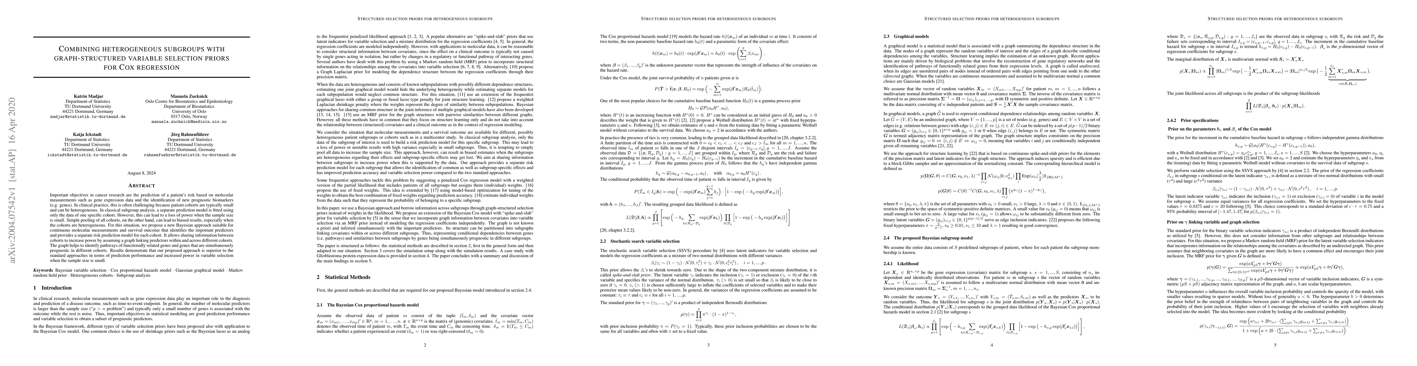 This research proposes a new Bayesian approach for Cox regression that combines heterogeneous subgroups using graph-structured variable selection priors to improve prediction performance and increase power in small patient cohorts.