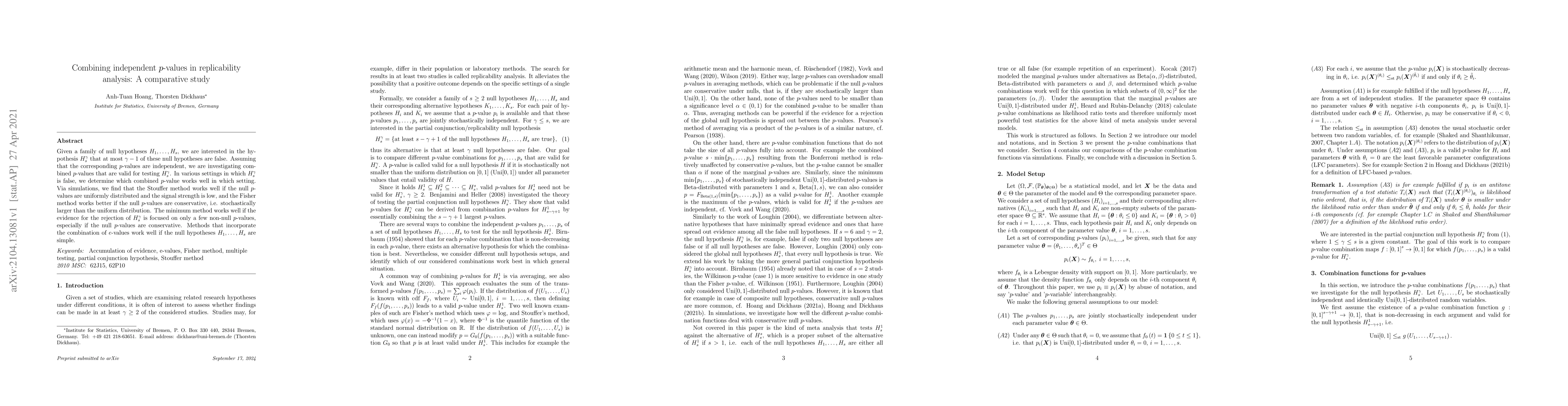 This paper investigates various methods for combining independent p-values to test the hypothesis $H_{s}^{\gamma}$ that at most $\gamma-1$ of $s$ null hypotheses are false. The Stouffer method is effective for uniformly distributed null $p$-values with low signal strength, while the Fisher method performs better with conservative $p$-values. The minimum method excels when evidence against $H_{s}^{\gamma}$ is concentrated in a few non-null $p$-values, especially with conservative null $p$-values. Combining $e$-values works well when the null hypotheses are simple.