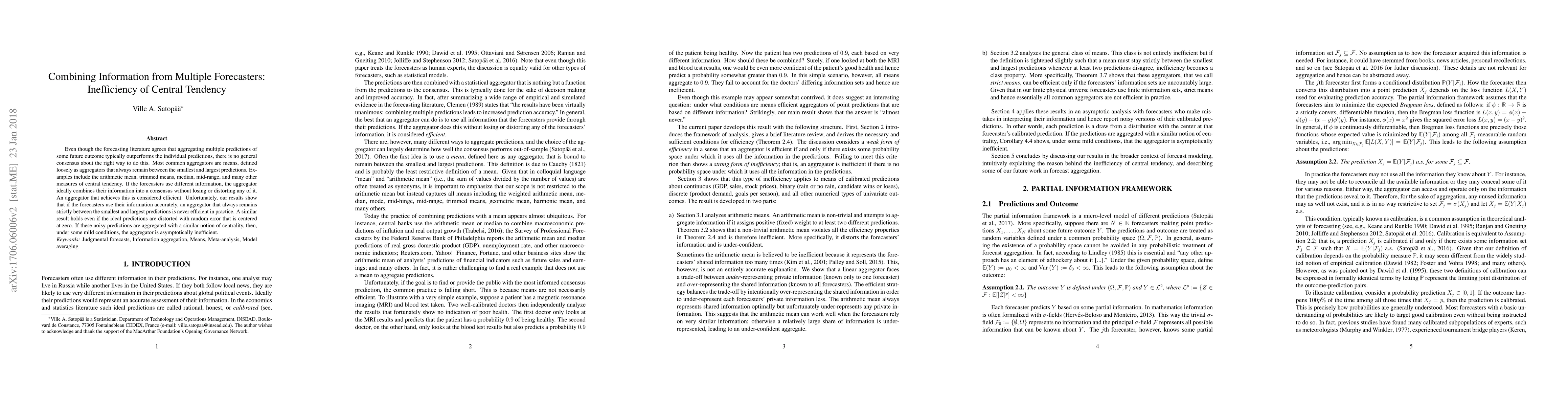 This paper argues that central tendency aggregators, such as means and medians, fail to efficiently combine forecasts from multiple forecasters who use different information, leading to inefficiency in practice. Even with random noise in predictions, these central tendency methods are shown to be asymptotically inefficient.