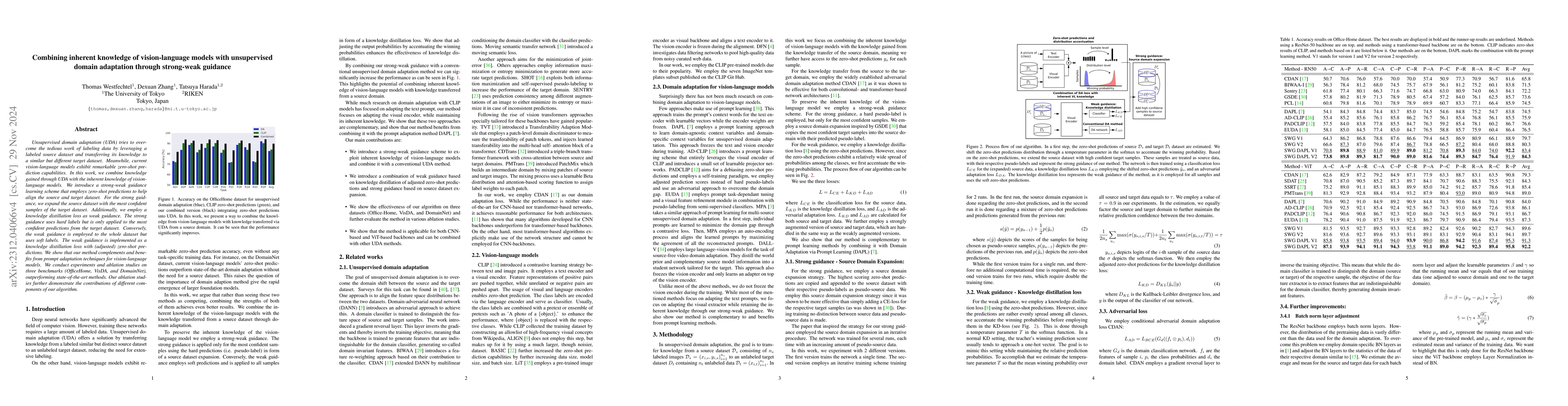 Unsupervised domain adaptation (UDA) tries to overcome the tedious work of labeling data by leveraging a labeled source dataset and transferring its knowledge to a similar but different target dataset. On the other hand, current vision-language models exhibit astonishing zero-shot prediction capabilities. In this work, we combine knowledge gained through UDA with the inherent knowledge of vision-language models. In a first step, we generate the zero-shot predictions of the source and target dataset using the vision-language model. Since zero-shot predictions usually exhibit a large entropy, meaning that the class probabilities are rather evenly distributed, we first adjust the distribution to accentuate the winning probabilities. This is done using both source and target data to keep the relative confidence between source and target data. We then employ a conventional DA method, to gain the knowledge from the source dataset, in combination with self-knowledge distillation, to maintain the inherent knowledge of the vision-language model. We further combine our method with a gradual source domain expansion strategy (GSDE) and show that this strategy can also benefit by including zero-shot predictions. We conduct experiments and ablation studies on three benchmarks (OfficeHome, VisDA, and DomainNet) and outperform state-of-the-art methods. We further show in ablation studies the contributions of different parts of our algorithm.