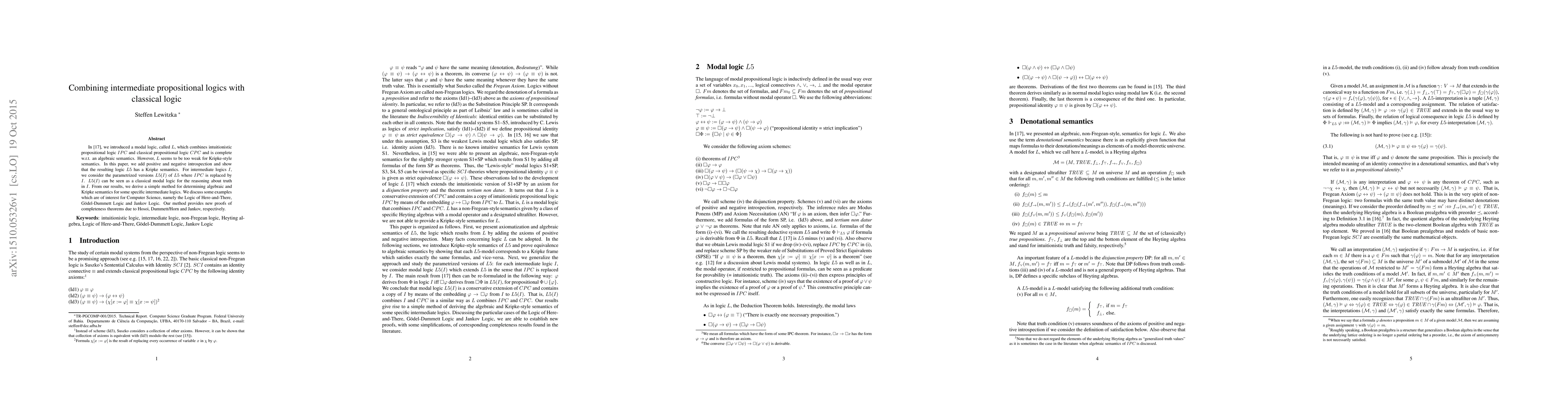 In [17], we introduced a modal logic, called $L$, which combines intuitionistic propositional logic $IPC$ and classical propositional logic $CPC$ and is complete w.r.t. an algebraic semantics. However, $L$ seems to be too weak for Kripke-style semantics. In this paper, we add positive and negative introspection and show that the resulting logic $L5$ has a Kripke semantics. For intermediate logics $I$, we consider the parametrized versions $L5(I)$ of $L5$ where $IPC$ is replaced by $I$. $L5(I)$ can be seen as a classical modal logic for the reasoning about truth in $I$. From our results, we derive a simple method for determining algebraic and Kripke semantics for some specific intermediate logics. We discuss some examples which are of interest for Computer Science, namely the Logic of Here-and-There, G\"odel-Dummett Logic and Jankov Logic. Our method provides new proofs of completeness theorems due to Hosoi, Dummett/Horn and Jankov, respectively.