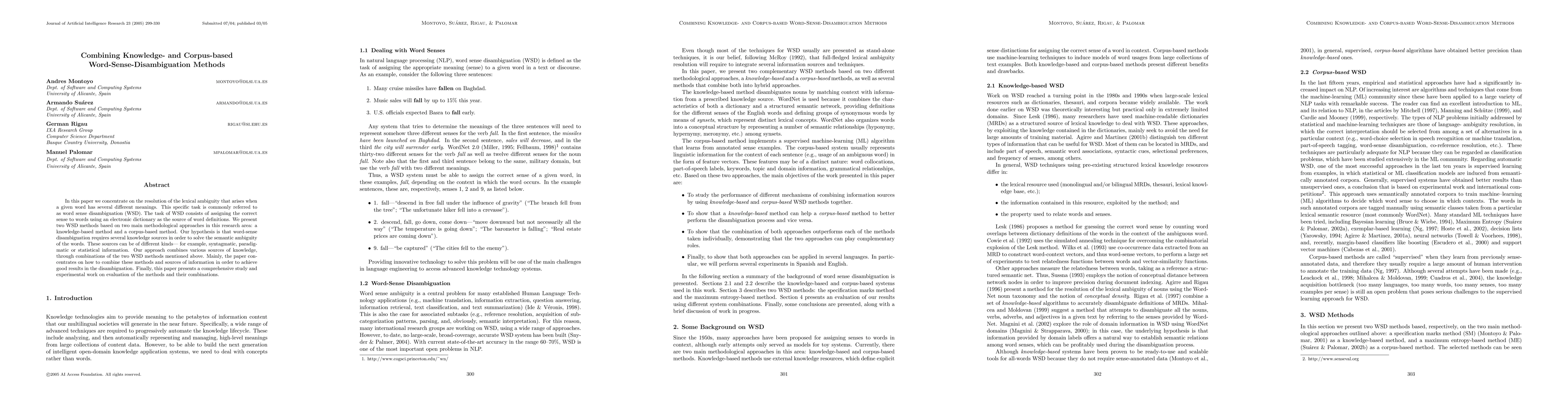 This paper explores combining knowledge-based and corpus-based methods for word sense disambiguation (WSD), aiming to leverage multiple sources of information to resolve lexical ambiguity. The study evaluates the effectiveness of integrating these approaches through experimental analysis.