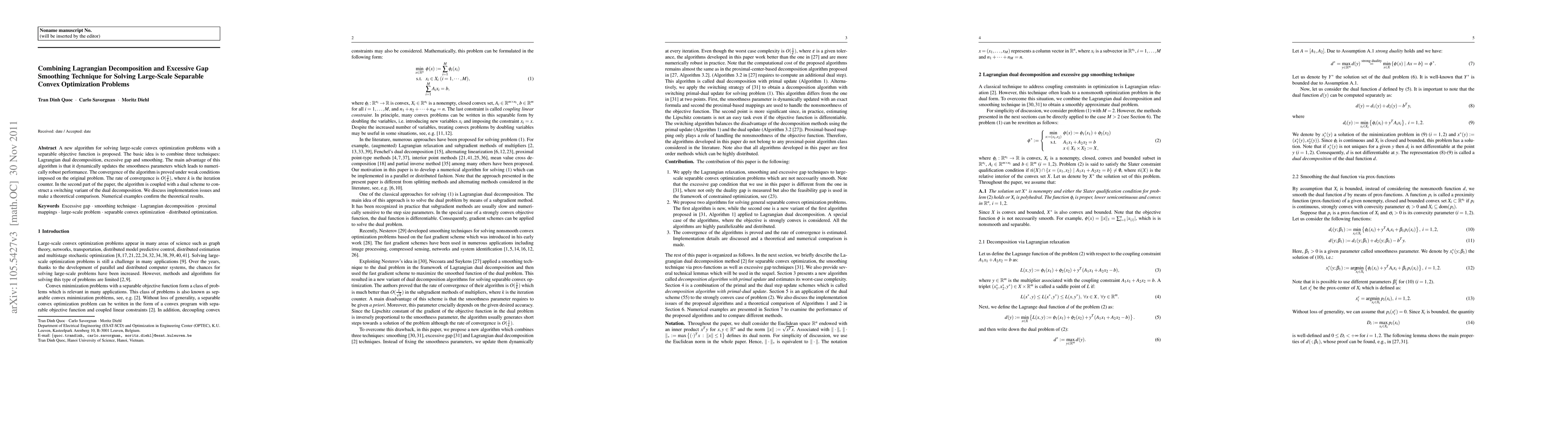 A new algorithm for solving large-scale convex optimization problems with a separable objective function is proposed. The basic idea is to combine three techniques: Lagrangian dual decomposition, excessive gap and smoothing. The main advantage of this algorithm is that it dynamically updates the smoothness parameters which leads to numerically robust performance. The convergence of the algorithm is proved under weak conditions imposed on the original problem. The rate of convergence is $O(\frac{1}{k})$, where $k$ is the iteration counter. In the second part of the paper, the algorithm is coupled with a dual scheme to construct a switching variant of the dual decomposition. We discuss implementation issues and make a theoretical comparison. Numerical examples confirm the theoretical results.