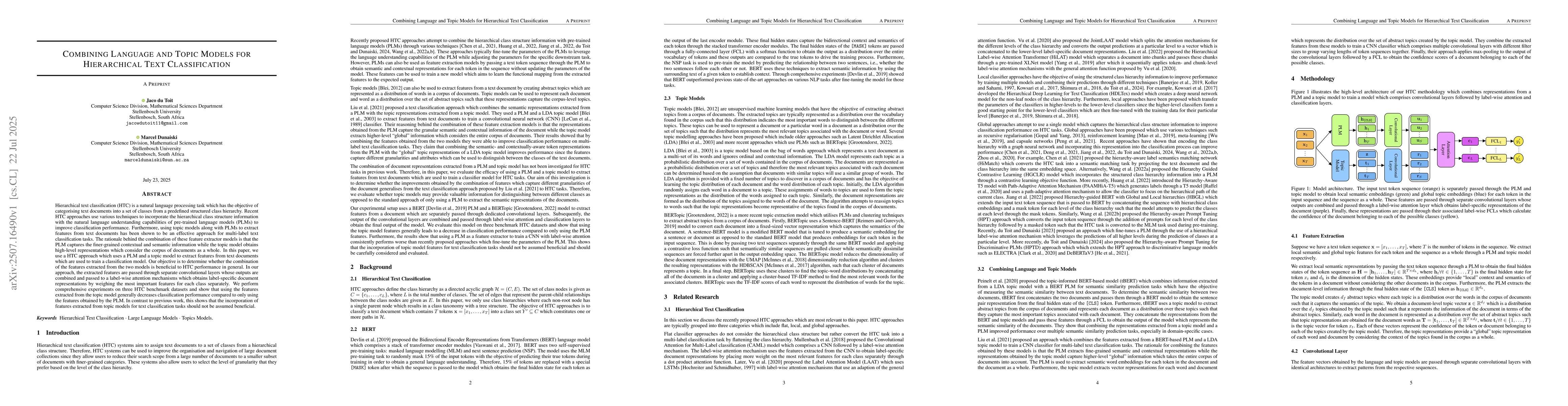 Hierarchical text classification (HTC) is a natural language processing task which has the objective of categorising text documents into a set of classes from a predefined structured class hierarchy. Recent HTC approaches use various techniques to incorporate the hierarchical class structure information with the natural language understanding capabilities of pre-trained language models (PLMs) to improve classification performance. Furthermore, using topic models along with PLMs to extract features from text documents has been shown to be an effective approach for multi-label text classification tasks. The rationale behind the combination of these feature extractor models is that the PLM captures the finer-grained contextual and semantic information while the topic model obtains high-level representations which consider the corpus of documents as a whole. In this paper, we use a HTC approach which uses a PLM and a topic model to extract features from text documents which are used to train a classification model. Our objective is to determine whether the combination of the features extracted from the two models is beneficial to HTC performance in general. In our approach, the extracted features are passed through separate convolutional layers whose outputs are combined and passed to a label-wise attention mechanisms which obtains label-specific document representations by weighing the most important features for each class separately. We perform comprehensive experiments on three HTC benchmark datasets and show that using the features extracted from the topic model generally decreases classification performance compared to only using the features obtained by the PLM. In contrast to previous work, this shows that the incorporation of features extracted from topic models for text classification tasks should not be assumed beneficial.