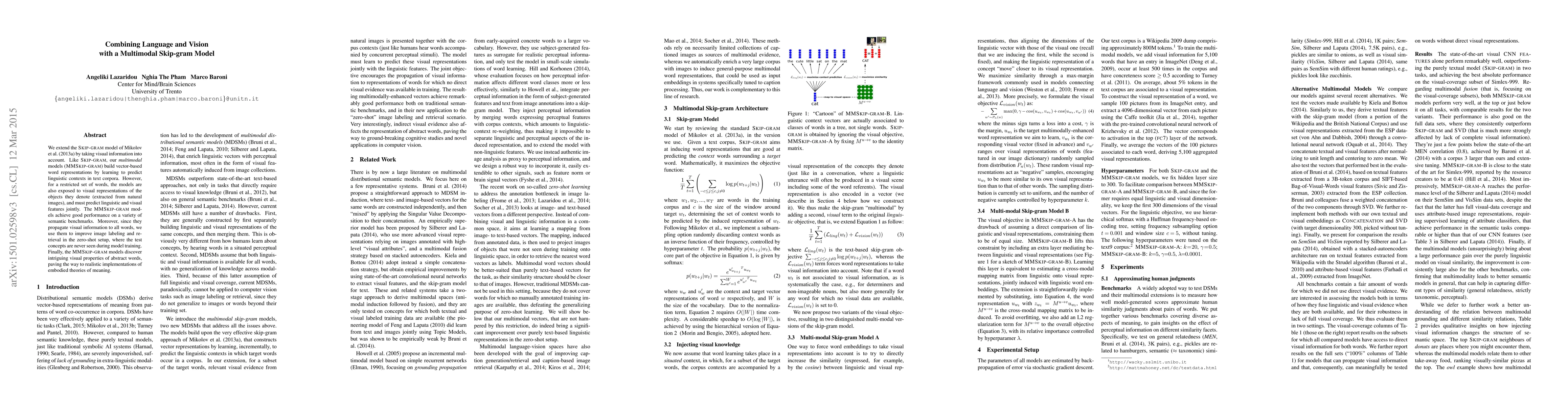 This paper introduces MMSKIP-GRAM, a multimodal extension of the SKIP-GRAM model that incorporates visual information to enhance word representations. The model improves semantic benchmarks and enables zero-shot image labeling and retrieval, revealing visual properties of abstract words.