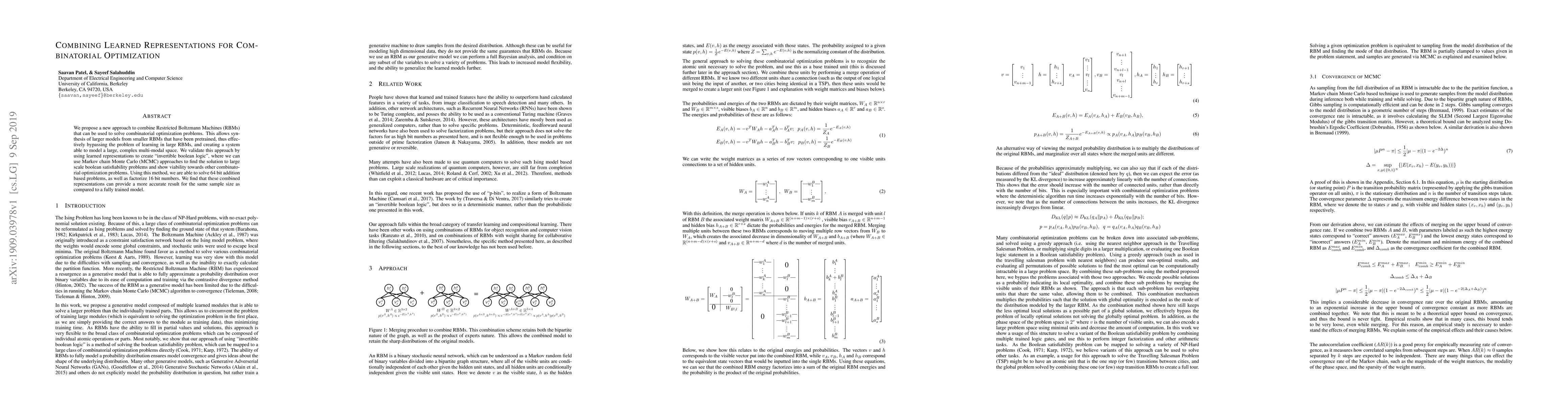 We propose a new approach to combine Restricted Boltzmann Machines (RBMs) that can be used to solve combinatorial optimization problems. This allows synthesis of larger models from smaller RBMs that have been pretrained, thus effectively bypassing the problem of learning in large RBMs, and creating a system able to model a large, complex multi-modal space. We validate this approach by using learned representations to create ``invertible boolean logic'', where we can use Markov chain Monte Carlo (MCMC) approaches to find the solution to large scale boolean satisfiability problems and show viability towards other combinatorial optimization problems. Using this method, we are able to solve 64 bit addition based problems, as well as factorize 16 bit numbers. We find that these combined representations can provide a more accurate result for the same sample size as compared to a fully trained model.