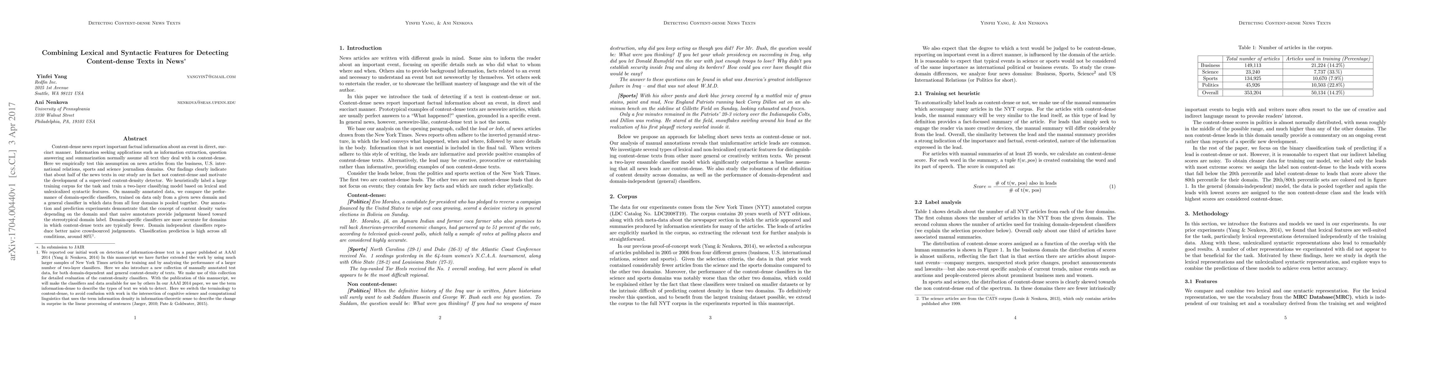 Content-dense news report important factual information about an event in direct, succinct manner. Information seeking applications such as information extraction, question answering and summarization normally assume all text they deal with is content-dense. Here we empirically test this assumption on news articles from the business, U.S. international relations, sports and science journalism domains. Our findings clearly indicate that about half of the news texts in our study are in fact not content-dense and motivate the development of a supervised content-density detector. We heuristically label a large training corpus for the task and train a two-layer classifying model based on lexical and unlexicalized syntactic features. On manually annotated data, we compare the performance of domain-specific classifiers, trained on data only from a given news domain and a general classifier in which data from all four domains is pooled together. Our annotation and prediction experiments demonstrate that the concept of content density varies depending on the domain and that naive annotators provide judgement biased toward the stereotypical domain label. Domain-specific classifiers are more accurate for domains in which content-dense texts are typically fewer. Domain independent classifiers reproduce better naive crowdsourced judgements. Classification prediction is high across all conditions, around 80%.