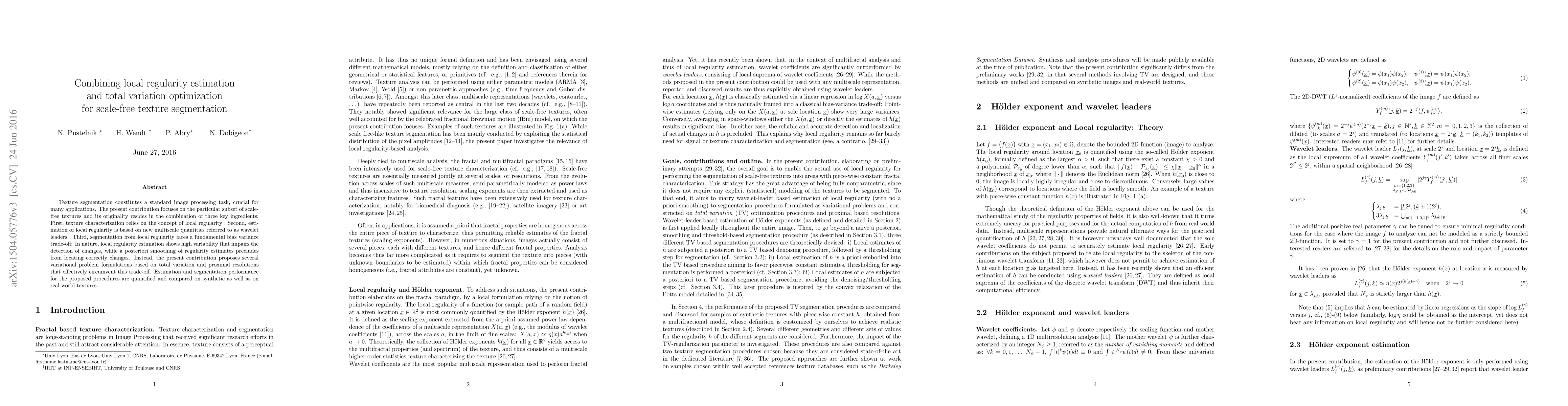 Texture segmentation constitutes a standard image processing task, crucial to many applications. The present contribution focuses on the particular subset of scale-free textures and its originality resides in the combination of three key ingredients: First, texture characterization relies on the concept of local regularity ; Second, estimation of local regularity is based on new multiscale quantities referred to as wavelet leaders ; Third, segmentation from local regularity faces a fundamental bias variance trade-off: In nature, local regularity estimation shows high variability that impairs the detection of changes, while a posteriori smoothing of regularity estimates precludes from locating correctly changes. Instead, the present contribution proposes several variational problem formulations based on total variation and proximal resolutions that effectively circumvent this trade-off. Estimation and segmentation performance for the proposed procedures are quantified and compared on synthetic as well as on real-world textures.
