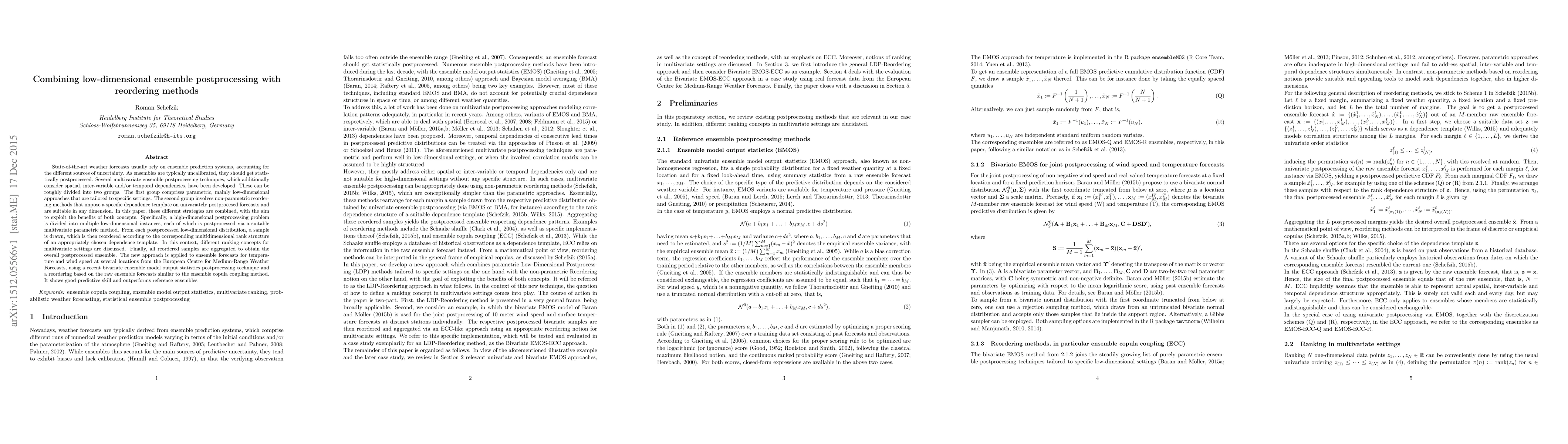 This paper combines low-dimensional ensemble postprocessing with reordering methods to enhance the calibration of state-of-the-art weather forecasts. It divides high-dimensional forecasts into low-dimensional instances, postprocesses each with parametric methods, and reorders samples to fit a multidimensional rank structure, showing improved predictive skill over reference ensembles.