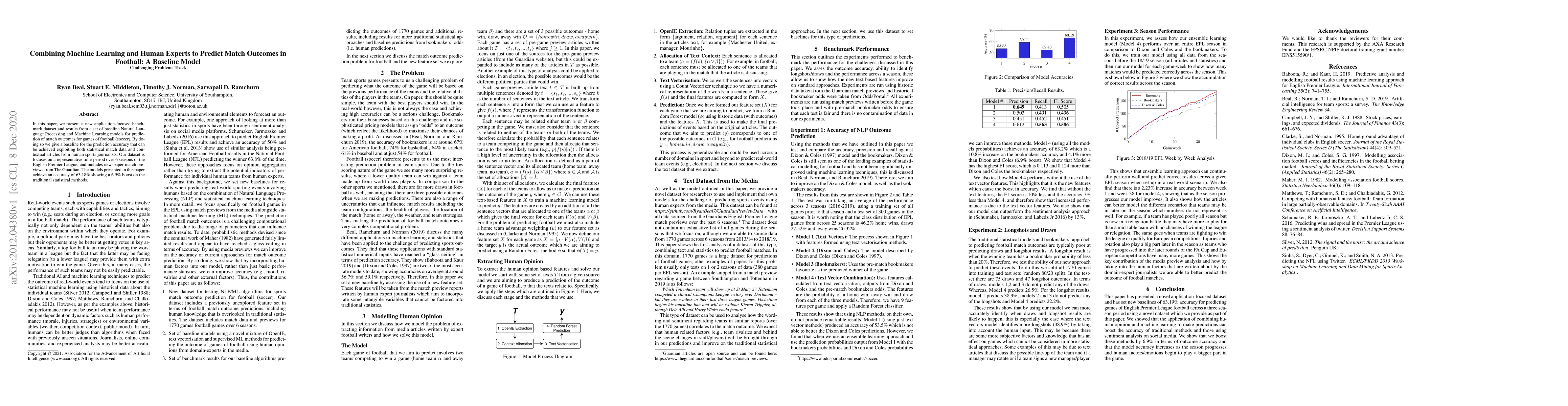 This research introduces a benchmark dataset and baseline models combining Natural Language Processing and Machine Learning to predict football match outcomes, achieving an accuracy of 63.18%. This represents a 6.9% improvement over traditional statistical methods, leveraging both statistical match data and contextual articles from human sports journalists. For more details, please refer to the original paper.