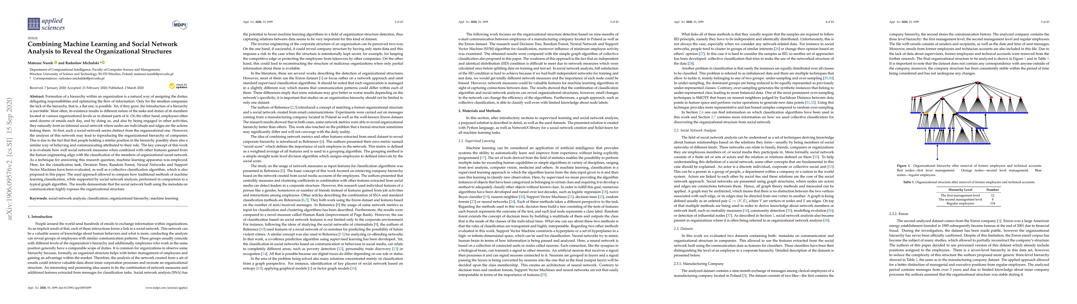 This paper combines machine learning and social network analysis to reveal organizational hierarchies by classifying members based on communication patterns. The study evaluates various machine learning techniques, including Decision Trees, Random Forest, Neural Networks, and Support Vector Machines, to determine how social network measures align with organizational structures.