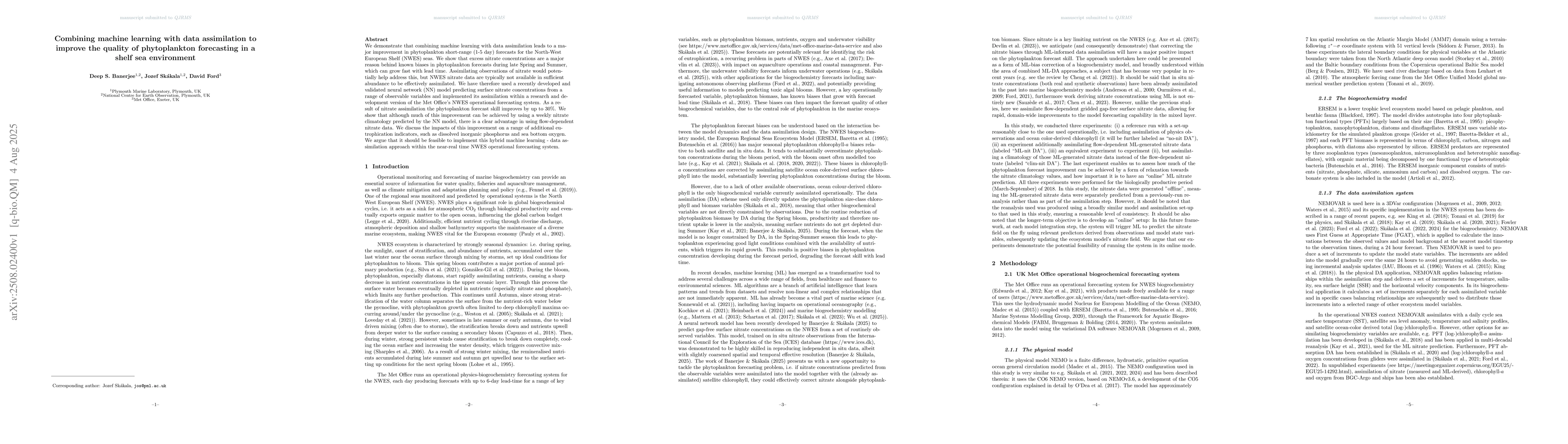 We demonstrate that combining machine learning with data assimilation leads to a major improvement in phytoplankton short-range (1-5 day) forecasts for the North-West European Shelf (NWES) seas. We show that excess nitrate concentrations are a major reason behind known biases in phytoplankton forecasts during late Spring and Summer, which can grow fast with lead time. Assimilating observations of nitrate would potentially help address this, but NWES nitrate data are typically not available in sufficient abundance to be effectively assimilated. We have therefore used a recently developed and validated neural network (NN) model predicting surface nitrate concentrations from a range of observable variables and implemented its assimilation within a research and development version of the Met Office's NWES operational forecasting system. As a result of nitrate assimilation the phytoplankton forecast skill improves by up to 30%. We show that although much of this improvement can be achieved by using a weekly nitrate climatology predicted by the NN model, there is a clear advantage in using flow-dependent nitrate data. We discuss the impacts of this improvement on a range of additional eutrophication indicators, such as dissolved inorganic phosphorus and sea bottom oxygen. We argue that it should be feasible to implement this hybrid machine learning - data assimilation approach within the near-real time NWES operational forecasting system.