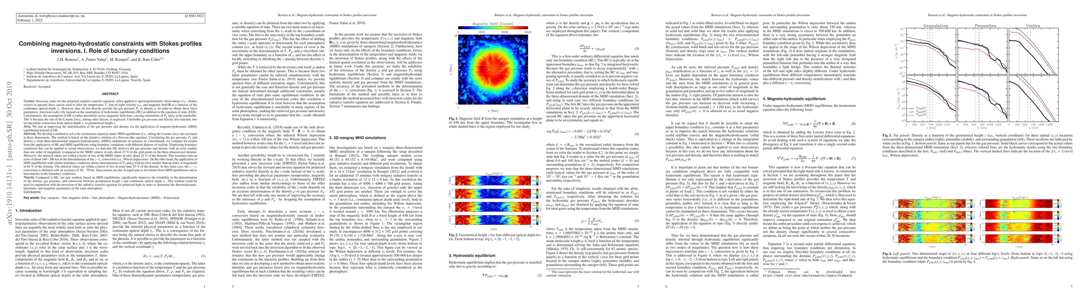 Inversion codes for the polarized radiative transfer equation can be used to infer the temperature $T$, line-of-sight velocity $v_{\rm los}$, and magnetic field $\rm{\bf B}$ as a function of the continuum optical-depth $\tau_{\rm c}$. However, they do not directly provide the gas pressure $P_{\rm g}$ or density $\rho$. In order to obtain these latter parameters, inversion codes rely instead on the assumption of hydrostatic equilibrium (HE) in addition to the equation of state (EOS). Unfortunately, the assumption of HE is rather unrealistic across magnetic field lines. This is because the role of the Lorentz force, among other factors, is neglected. This translates into an inaccurate conversion from optical depth $\tau_{\rm c}$ to geometrical height $z$. We aim at improving this conversion via the application of magneto-hydrostatic (MHS) equilibrium instead of HE. We develop a method to solve the momentum equation under MHS equilibrium (i.e., taking the Lorentz force into account) in three dimensions. The method is based on the solution of a Poisson-like equation. Considering the gas pressure $P_{\rm g}$ and density $\rho$ from three-dimensional magneto-hydrodynamic (MHD) simulations of sunspots as a benchmark, we compare the results from the application of HE and MHS equilibrium. We find that HE retrieves the gas pressure and density within an order of magnitude of the MHD values in only about 47 \% of the domain. This translates into an error of about $160-200$ km in the determination of the $z-\tau_{\rm c}$ conversion. On the other hand, the application of MHS equilibrium allows determination of $P_{\rm g}$ and $\rho$ within an order of magnitude in 84 \% of the domain. In this latter case, the $z-\tau_{\rm c}$ conversion is obtained with an accuracy of $30-70$ km.