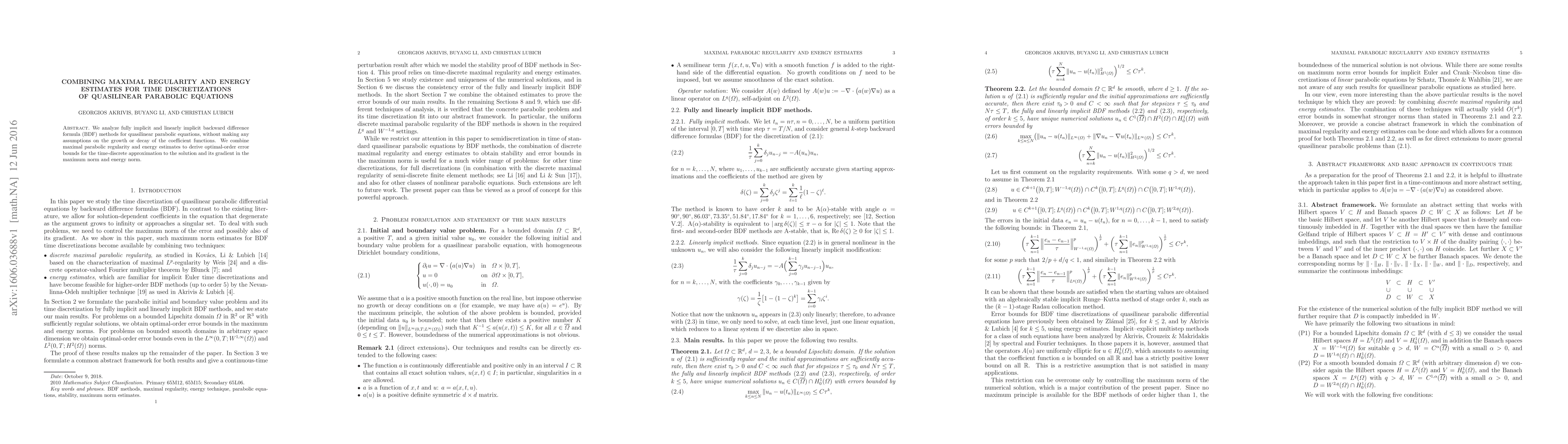 This paper analyzes fully and linearly implicit BDF methods for quasilinear parabolic equations, combining maximal regularity and energy estimates to derive optimal-order error bounds for both the solution and its gradient in maximum and energy norms, without assumptions on coefficient function growth or decay.