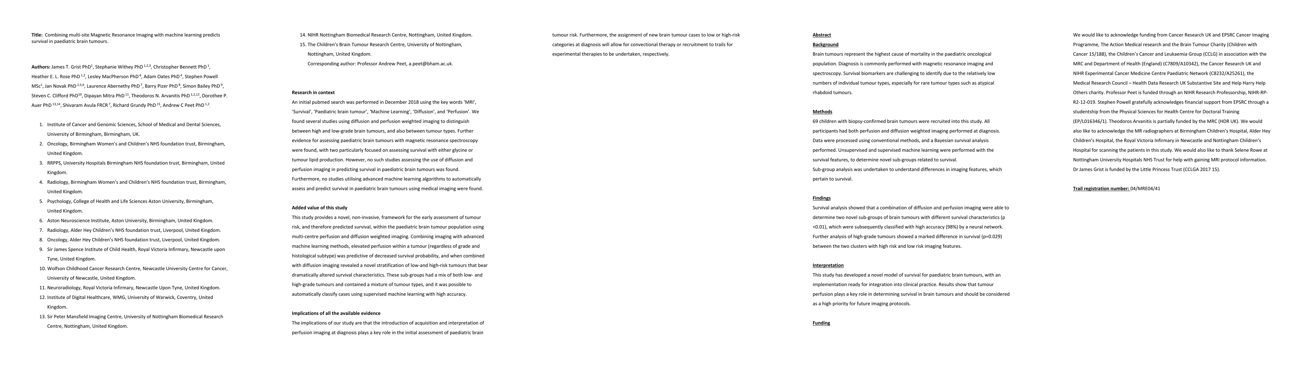 This study combines multi-site MRI with machine learning to predict survival in pediatric brain tumours, identifying two novel sub-groups with distinct survival outcomes. The model, which integrates perfusion and diffusion imaging, shows high accuracy and suggests tumour perfusion as a critical factor for future imaging protocols.