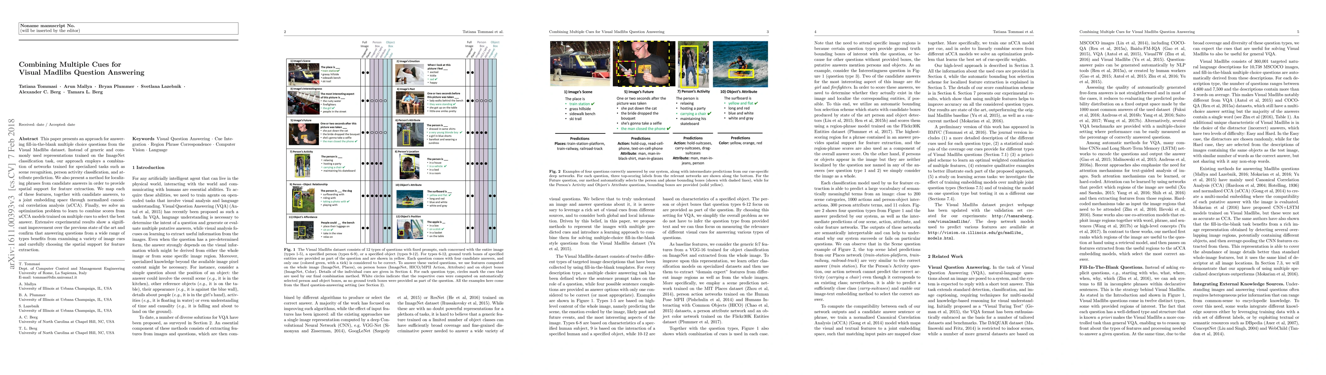 This paper proposes a new approach to answering visual Madlibs questions by combining features from scene recognition, person activity classification, and attribute prediction to improve accuracy. It achieves significant improvement over previous state-of-the-art methods by using multiple cues and careful feature extraction.