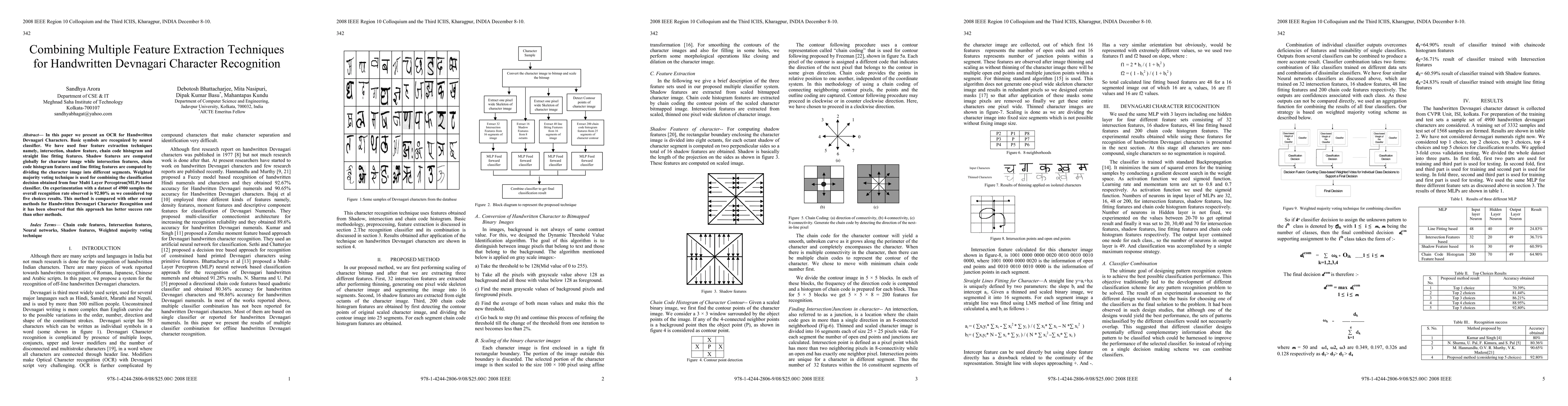 This paper proposes an OCR system for Handwritten Devnagari characters using a combination of four feature extraction techniques and a neural classifier. The overall recognition rate of 92.80% is achieved through a weighted majority voting technique combining results from four MLP classifiers, outperforming other recent methods.