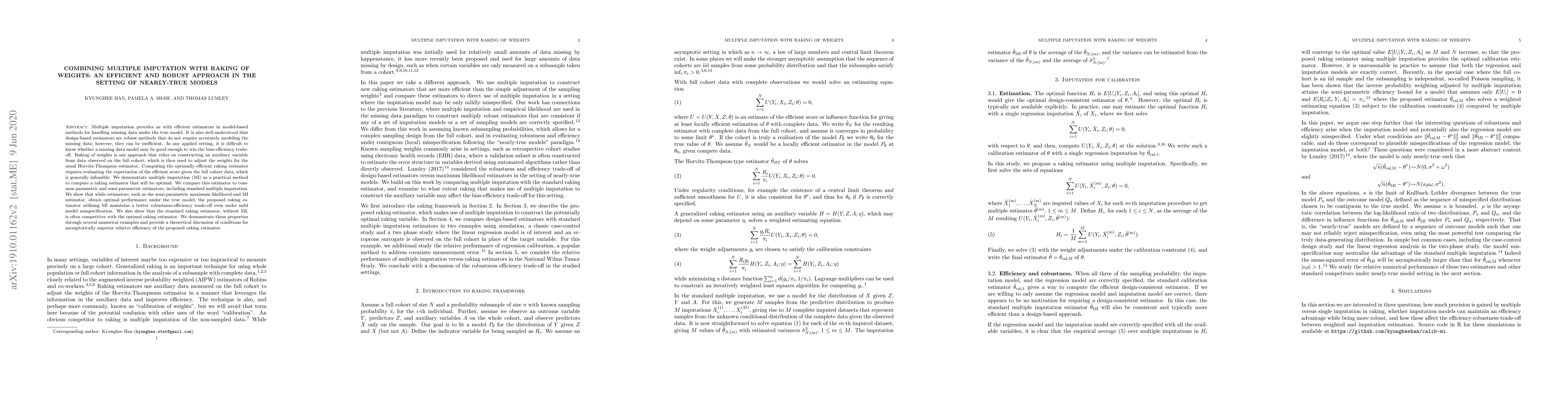 This research proposes a method that combines multiple imputation with raking of weights for efficient and robust handling of missing data, especially under model misspecification. It demonstrates that this combined approach outperforms standard methods in terms of the bias-efficiency trade-off, offering better robustness even when the assumed model isn't perfectly true.