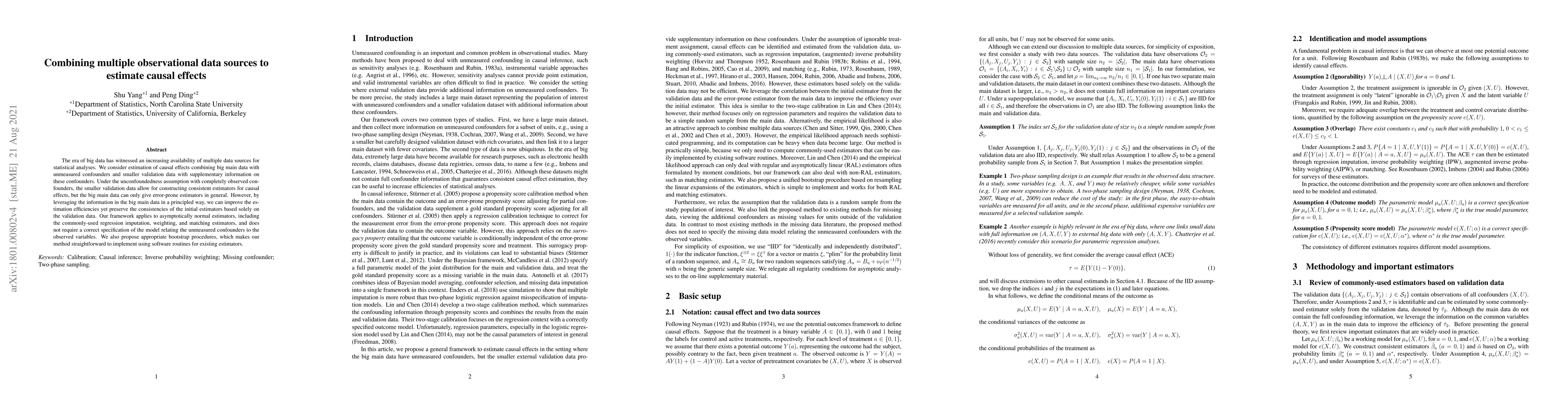 The era of big data has witnessed an increasing availability of multiple data sources for statistical analyses. We consider estimation of causal effects combining big main data with unmeasured confounders and smaller validation data with supplementary information on these confounders. Under the unconfoundedness assumption with completely observed confounders, the smaller validation data allow for constructing consistent estimators for causal effects, but the big main data can only give error-prone estimators in general. However, by leveraging the information in the big main data in a principled way, we can improve the estimation efficiencies yet preserve the consistencies of the initial estimators based solely on the validation data. Our framework applies to asymptotically normal estimators, including the commonly-used regression imputation, weighting, and matching estimators, and does not require a correct specification of the model relating the unmeasured confounders to the observed variables. We also propose appropriate bootstrap procedures, which makes our method straightforward to implement using software routines for existing estimators.