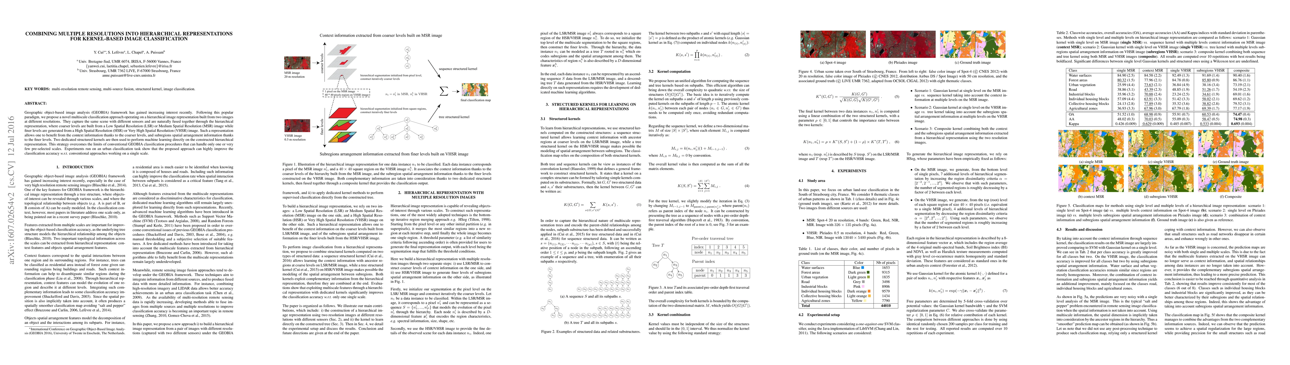 Geographic object-based image analysis (GEOBIA) framework has gained increasing interest recently. Following this popular paradigm, we propose a novel multiscale classification approach operating on a hierarchical image representation built from two images at different resolutions. They capture the same scene with different sensors and are naturally fused together through the hierarchical representation, where coarser levels are built from a Low Spatial Resolution (LSR) or Medium Spatial Resolution (MSR) image while finer levels are generated from a High Spatial Resolution (HSR) or Very High Spatial Resolution (VHSR) image. Such a representation allows one to benefit from the context information thanks to the coarser levels, and subregions spatial arrangement information thanks to the finer levels. Two dedicated structured kernels are then used to perform machine learning directly on the constructed hierarchical representation. This strategy overcomes the limits of conventional GEOBIA classification procedures that can handle only one or very few pre-selected scales. Experiments run on an urban classification task show that the proposed approach can highly improve the classification accuracy w.r.t. conventional approaches working on a single scale.