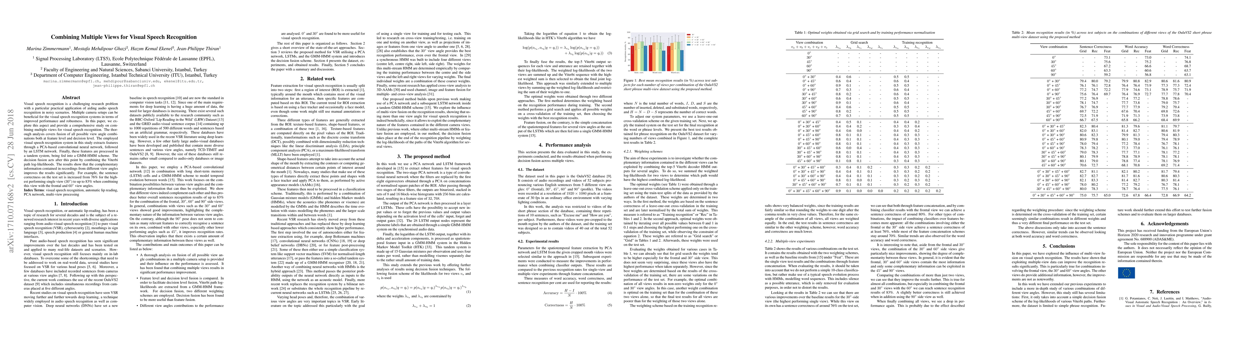 This paper investigates the benefits of combining multiple camera views for visual speech recognition, showing significant performance improvements through feature and decision level fusion. The system, utilizing PCA-based CNN and LSTM, achieves a sentence correctness increase from 76% to 83% by integrating complementary information from different view angles.