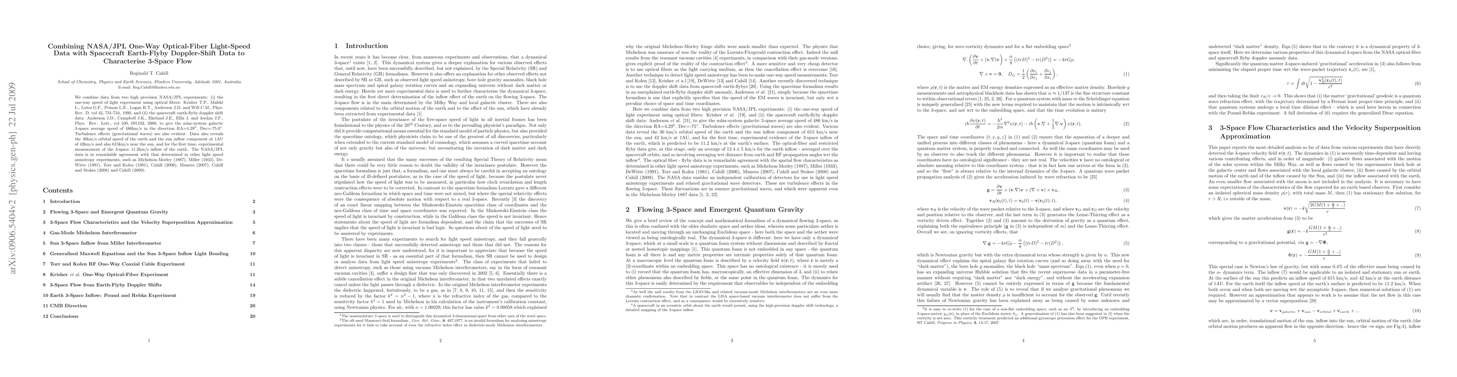 This research combines NASA/JPL's one-way optical-fiber light-speed data with spacecraft Earth-flyby Doppler-shift data, determining the solar system's average speed through galactic 3-space at 486km/s. It also identifies turbulence effects, Earth's orbital speed, Sun's inflow at 1AU, and the first experimental measurement of Earth's inflow speed at 11.2km/s, aligning with previous light speed anisotropy experiments.