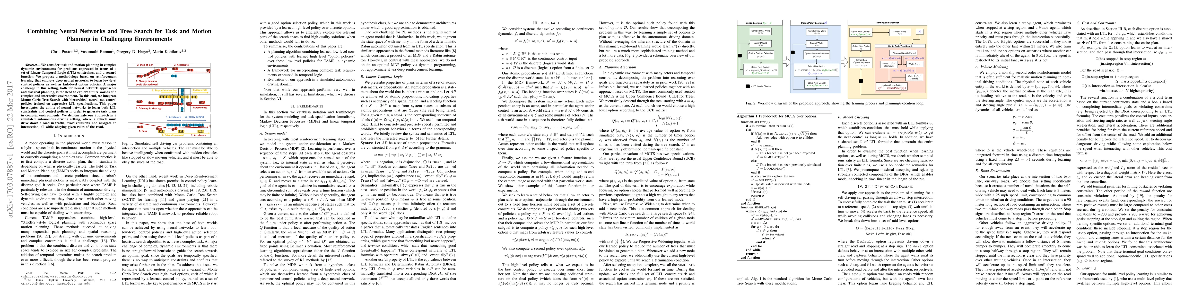 We consider task and motion planning in complex dynamic environments for problems expressed in terms of a set of Linear Temporal Logic (LTL) constraints, and a reward function. We propose a methodology based on reinforcement learning that employs deep neural networks to learn low-level control policies as well as task-level option policies. A major challenge in this setting, both for neural network approaches and classical planning, is the need to explore future worlds of a complex and interactive environment. To this end, we integrate Monte Carlo Tree Search with hierarchical neural net control policies trained on expressive LTL specifications. This paper investigates the ability of neural networks to learn both LTL constraints and control policies in order to generate task plans in complex environments. We demonstrate our approach in a simulated autonomous driving setting, where a vehicle must drive down a road in traffic, avoid collisions, and navigate an intersection, all while obeying given rules of the road.