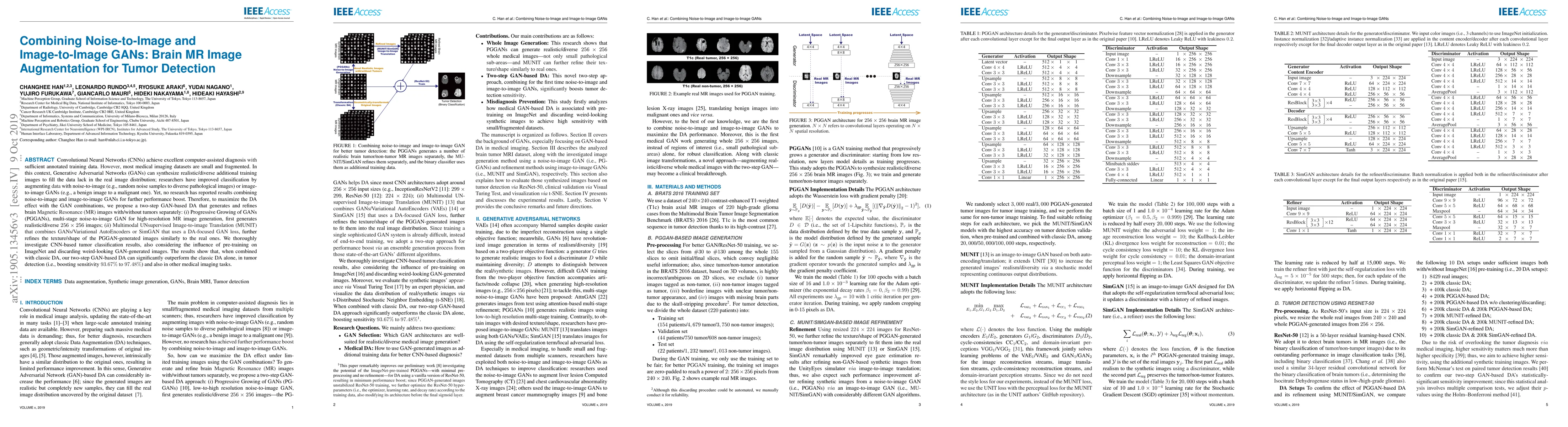 This paper proposes a two-step GAN-based data augmentation approach combining noise-to-image and image-to-image GANs to synthesize additional brain MR images for tumor detection. The method uses PGGANs for high-resolution image generation and MUNIT for refinement, significantly improving tumor classification sensitivity by up to 4.81%.