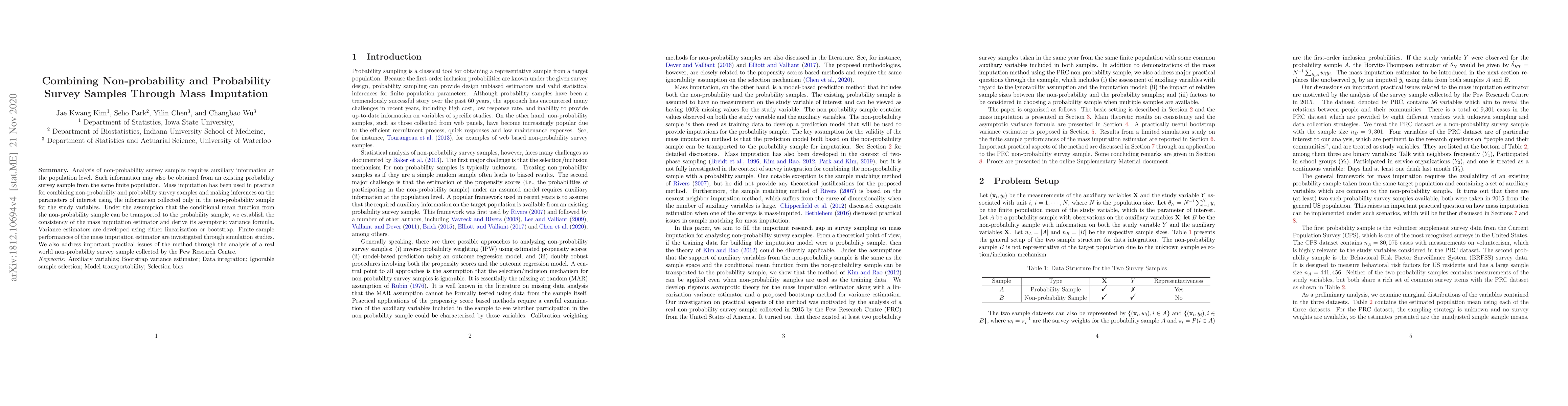 This paper theoretically justifies combining non-probability and probability survey samples via mass imputation, establishing its consistency and deriving an asymptotic variance formula. Simulation studies and an application to Pew Research Centre data demonstrate the approach's finite sample performance.