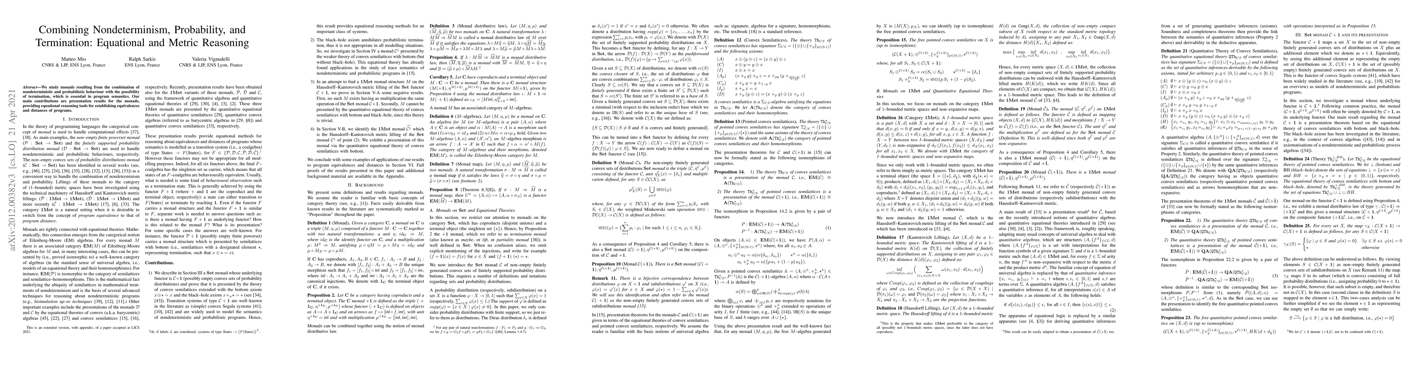 This paper explores monads that integrate nondeterminism, probability, and termination in program semantics. It presents equational reasoning tools to establish program equivalences and measure distances between programs.