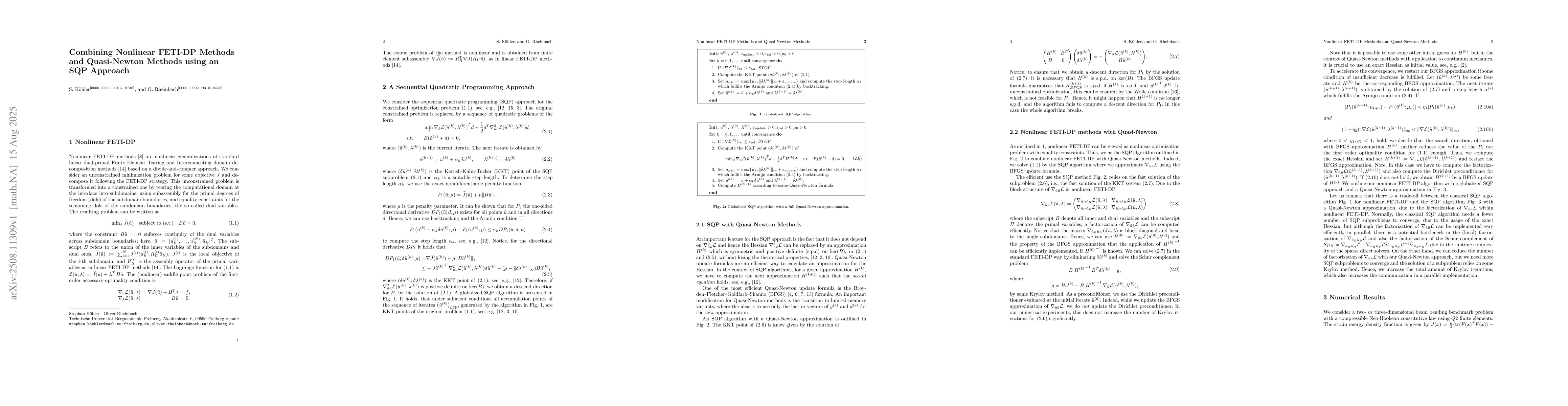 The combination of nonlinear FETI-DP (Dual Primal Finite Element Tearing and Interconnecting) and Quasi-Newton methods using a sequential quadratic programming (SQP) approach is considered. Nonlinear FETI-DP methods are parallel iterative solution methods for nonlinear finite element problems, based on divide and conquer, using Lagrange multipliers. In the method, we use Quasi-Newton approximations of Hessian for the quadratic programs, where the initial approximation uses the exact Hessian. To accelerate the convergence, we recompute the initial Hessian and restart the Quasi-Newton approximation. We provide numerical experiments using homogeneous model problems from nonlinear structural mechanics.
