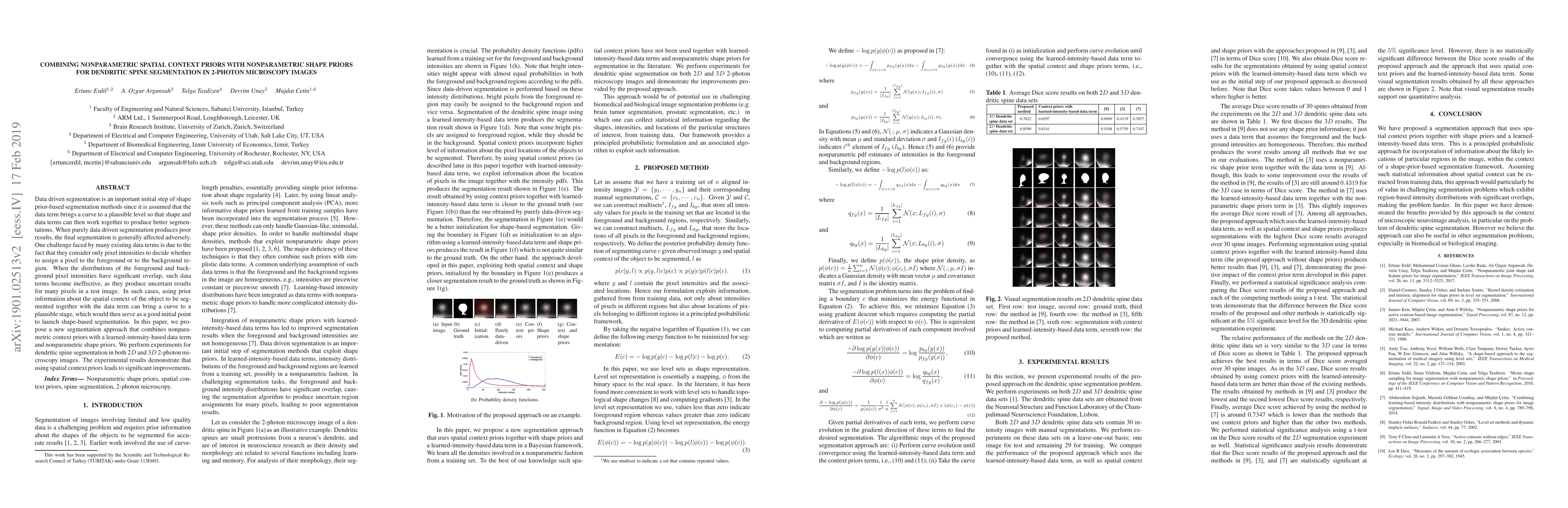 This paper proposes a novel segmentation method combining nonparametric spatial context priors with nonparametric shape priors to improve dendritic spine segmentation in 2-photon microscopy images. The approach enhances data-driven segmentation by incorporating spatial context, leading to significant improvements over traditional methods.