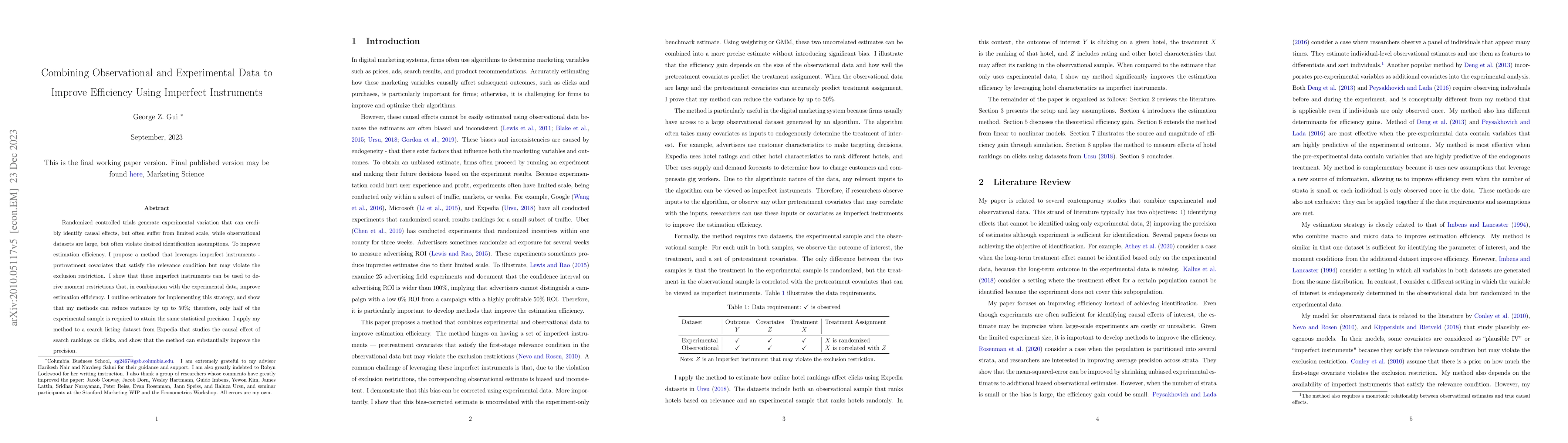 This paper proposes a method to enhance estimation efficiency by combining observational and experimental data using imperfect instruments. The method leverages pretreatment covariates to derive moment restrictions, reducing variance by up to 50% and requiring only half the experimental sample size for the same precision, demonstrated through an application to a search listing dataset.