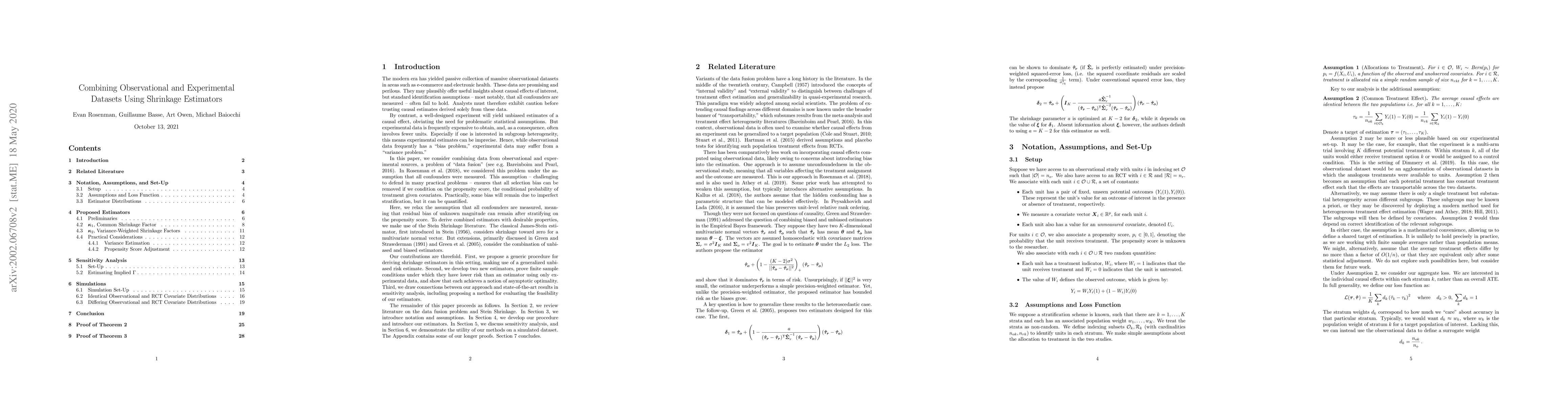 This paper proposes a method to combine observational and experimental datasets using shrinkage estimators to make causal conclusions, addressing scenarios where not all confounders are measured. It introduces a new procedure for deriving shrinkage estimators, develops two new estimators, and establishes their finite sample and asymptotic optimality, while also linking the approach to sensitivity analysis.