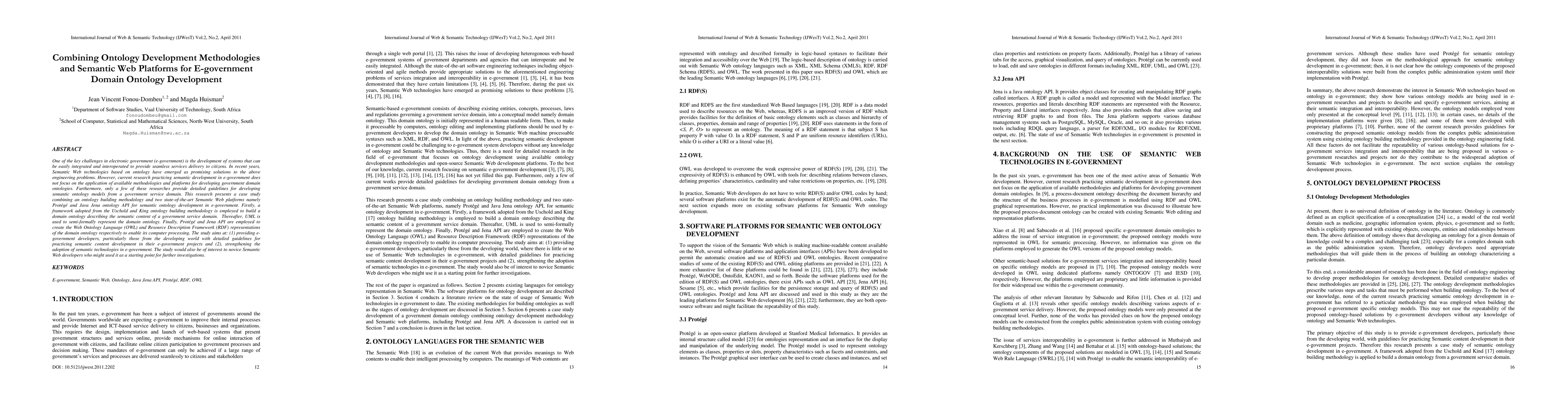 This research combines ontology development methodologies with Semantic Web platforms to create a framework for e-government domain ontology. It employs Uschold and King's methodology, UML, Protege, and Jena API for developing and representing government service domain ontologies, aiming to provide detailed guidelines for e-government developers and enhance the adoption of semantic technologies.