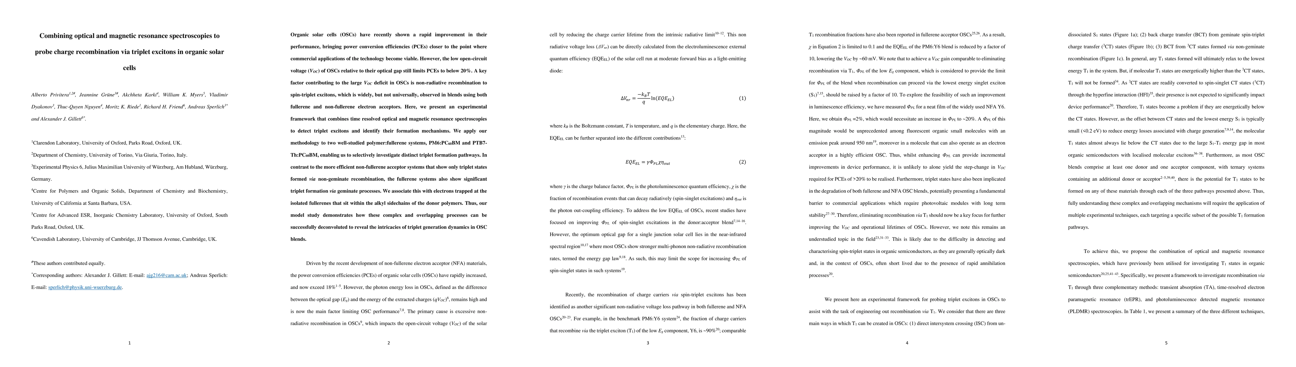 This paper combines optical and magnetic resonance spectroscopies to investigate charge recombination via triplet excitons in organic solar cells, revealing distinct triplet formation pathways in polymer:fullerene blends. Fullerene systems show significant triplet formation via geminate processes due to electron trapping, contrasting with non-fullerene systems.