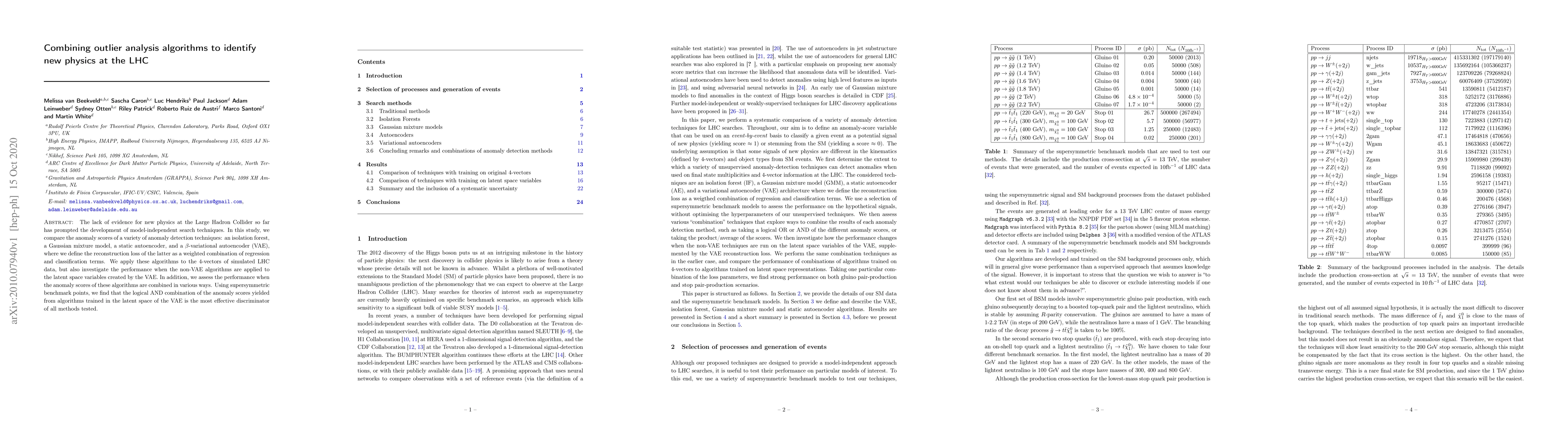 This study compares multiple anomaly detection algorithms, including isolation forest, Gaussian mixture model, static autoencoder, and a beta-variational autoencoder, to identify new physics at the LHC. The results show that combining anomaly scores from algorithms trained on VAE's latent space, specifically using a logical AND, is most effective for distinguishing new physics scenarios.