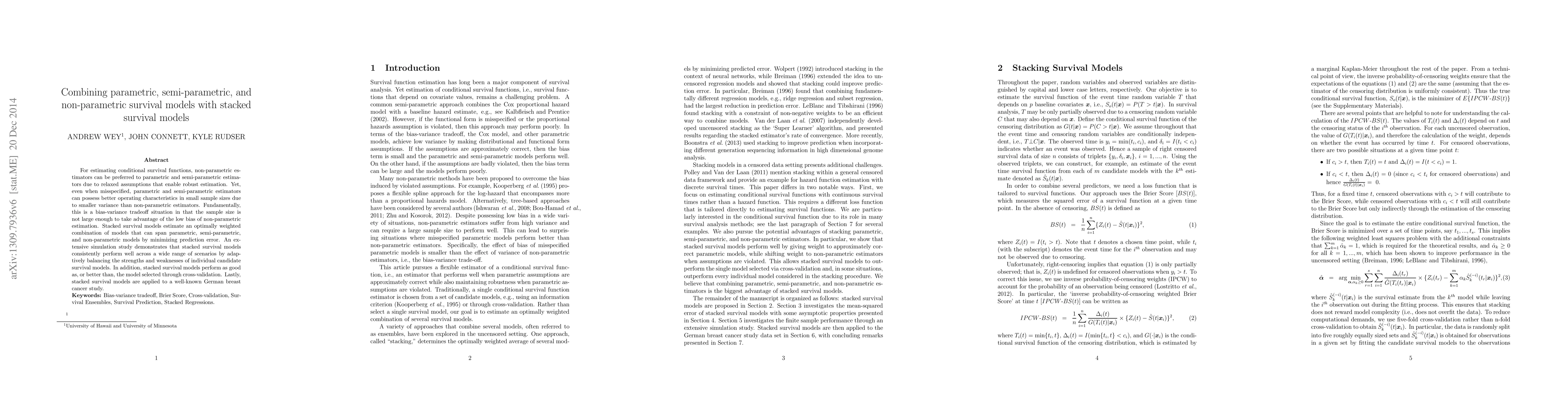 For estimating conditional survival functions, non-parametric estimators can be preferred to parametric and semi-parametric estimators due to relaxed assumptions that enable robust estimation. Yet, even when misspecified, parametric and semi-parametric estimators can possess better operating characteristics in small sample sizes due to smaller variance than non-parametric estimators. Fundamentally, this is a bias-variance tradeoff situation in that the sample size is not large enough to take advantage of the low bias of non-parametric estimation. Stacked survival models estimate an optimally weighted combination of models that can span parametric, semi-parametric, and non-parametric models by minimizing prediction error. An extensive simulation study demonstrates that stacked survival models consistently perform well across a wide range of scenarios by adaptively balancing the strengths and weaknesses of individual candidate survival models. In addition, stacked survival models perform as good as, or better than, the model selected through cross-validation. Lastly, stacked survival models are applied to a well-known German breast cancer study.