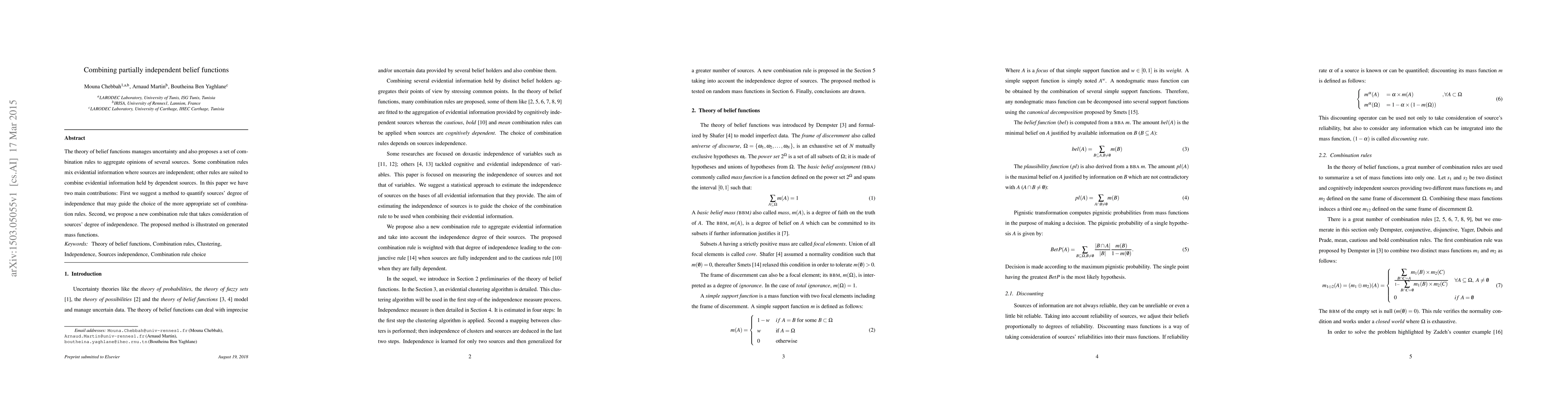 The theory of belief functions manages uncertainty and also proposes a set of combination rules to aggregate opinions of several sources. Some combination rules mix evidential information where sources are independent; other rules are suited to combine evidential information held by dependent sources. In this paper we have two main contributions: First we suggest a method to quantify sources' degree of independence that may guide the choice of the more appropriate set of combination rules. Second, we propose a new combination rule that takes consideration of sources' degree of independence. The proposed method is illustrated on generated mass functions.