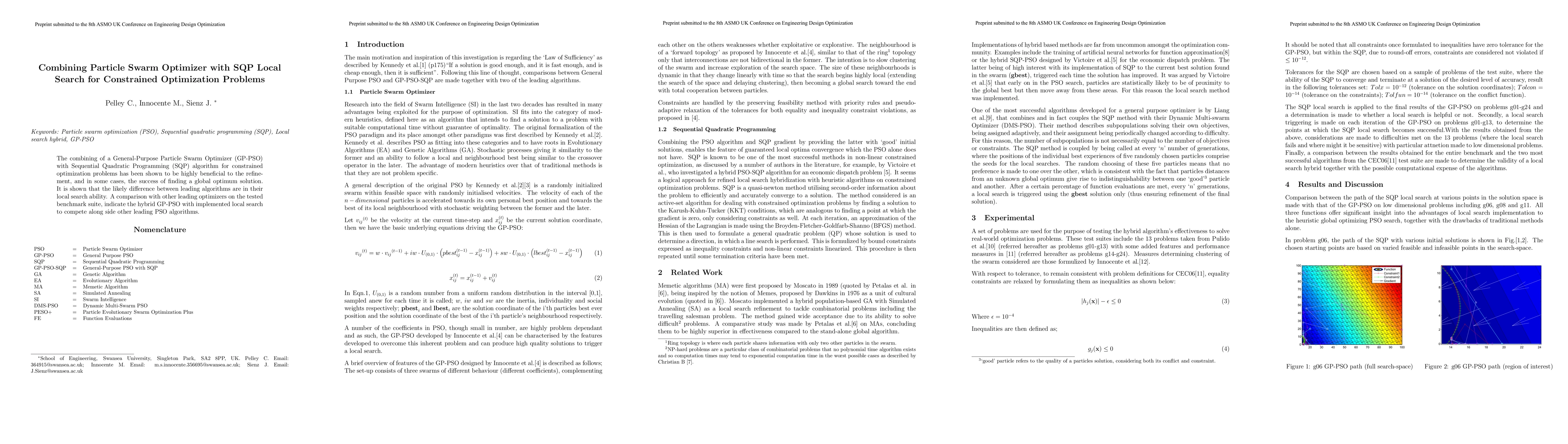 This paper combines a General-Purpose Particle Swarm Optimizer (GP-PSO) with Sequential Quadratic Programming (SQP) for solving constrained optimization problems, demonstrating improved local search ability and competitive performance against other leading optimizers. The hybrid approach effectively refines solutions and enhances the likelihood of finding global optima.