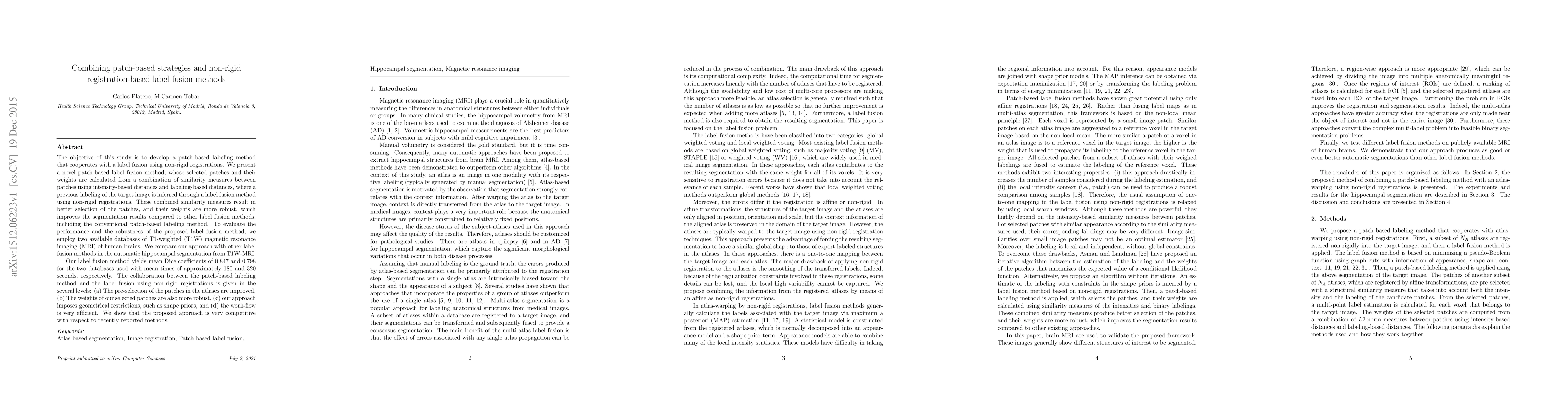 The objective of this study is to develop a patch-based labeling method that cooperates with a label fusion using non-rigid registrations. We present a novel patch-based label fusion method, whose selected patches and their weights are calculated from a combination of similarity measures between patches using intensity-based distances and labeling-based distances, where a previous labeling of the target image is inferred through a label fusion method using non-rigid registrations. These combined similarity measures result in better selection of the patches, and their weights are more robust, which improves the segmentation results compared to other label fusion methods, including the conventional patch-based labeling method. To evaluate the performance and the robustness of the proposed label fusion method, we employ two available databases of T1-weighted (T1W) magnetic resonance imaging (MRI) of human brains. We compare our approach with other label fusion methods in the automatic hippocampal segmentation from T1W-MRI. Our label fusion method yields mean Dice coefficients of 0.847 and 0.798 for the two databases used with mean times of approximately 180 and 320 seconds, respectively. The collaboration between the patch-based labeling method and the label fusion using non-rigid registrations is given in the several levels: (a) The pre-selection of the patches in the atlases are improved, (b) The weights of our selected patches are also more robust, (c) our approach imposes geometrical restrictions, such as shape priors, and (d) the work-flow is very efficient. We show that the proposed approach is very competitive with respect to recently reported methods.