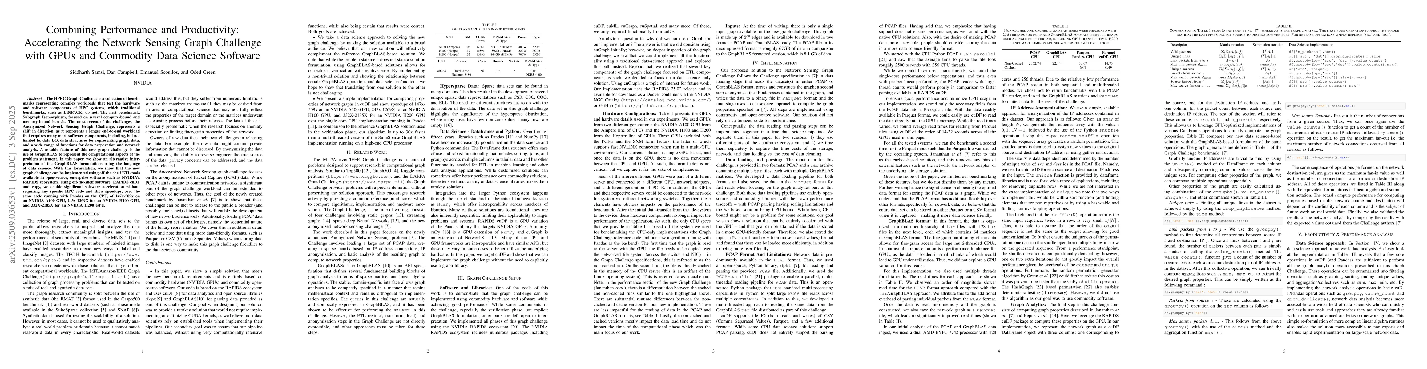 The HPEC Graph Challenge is a collection of benchmarks representing complex workloads that test the hardware and software components of HPC systems, which traditional benchmarks, such as LINPACK, do not. The first benchmark, Subgraph Isomorphism, focused on several compute-bound and memory-bound kernels. The most recent of the challenges, the Anonymized Network Sensing Graph Challenge, represents a shift in direction, as it represents a longer end-to-end workload that requires many more software components, including, but not limited to, data I/O, data structures for representing graph data, and a wide range of functions for data preparation and network analysis. A notable feature of this new graph challenge is the use of GraphBLAS to represent the computational aspects of the problem statement. In this paper, we show an alternative interpretation of the GraphBLAS formulations using the language of data science. With this formulation, we show that the new graph challenge can be implemented using off-the-shelf ETL tools available in open-source, enterprise software such as NVIDIA's RAPIDS ecosystem. Using off-the-shelf software, RAPIDS cuDF and cupy, we enable significant software acceleration without requiring any specific HPC code and show speedups, over the same code running with Pandas on the CPU, of 147x-509x on an NVIDIA A100 GPU, 243x-1269X for an NVIDIA H100 GPU, and 332X-2185X for an NVIDIA H200 GPU.
