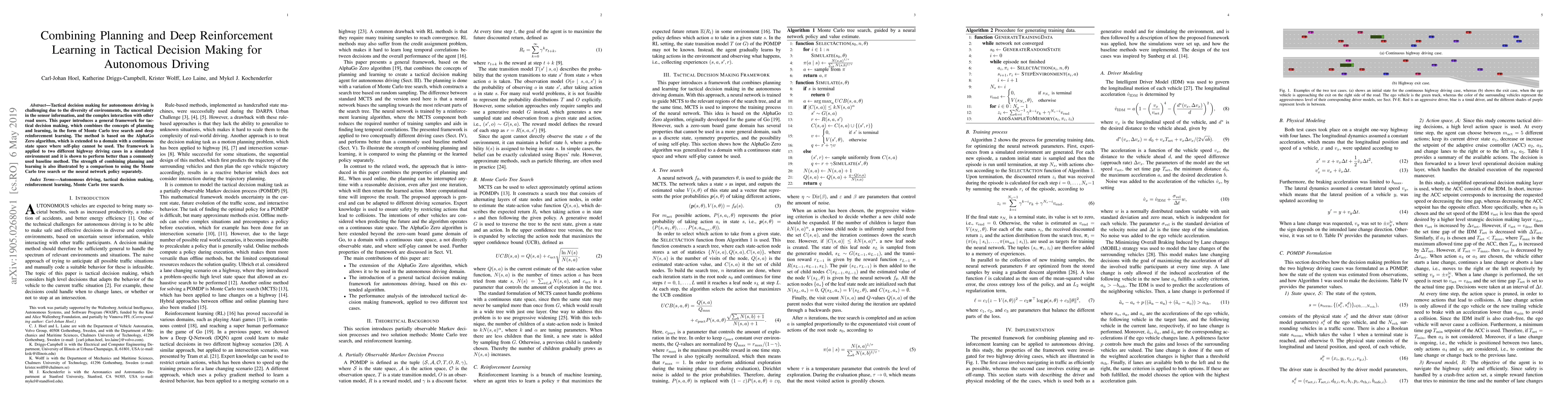 This paper presents a hybrid framework for tactical decision making in autonomous driving that combines planning via Monte Carlo tree search with deep reinforcement learning. The approach, inspired by AlphaGo Zero, outperforms baseline methods in simulated highway driving scenarios, demonstrating the benefits of integrating both planning and learning.
