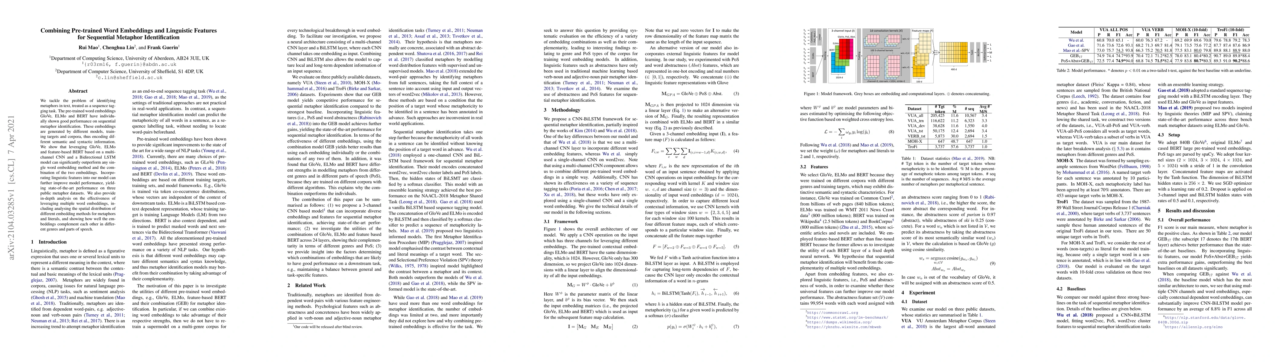 We tackle the problem of identifying metaphors in text, treated as a sequence tagging task. The pre-trained word embeddings GloVe, ELMo and BERT have individually shown good performance on sequential metaphor identification. These embeddings are generated by different models, training targets and corpora, thus encoding different semantic and syntactic information. We show that leveraging GloVe, ELMo and feature-based BERT based on a multi-channel CNN and a Bidirectional LSTM model can significantly outperform any single word embedding method and the combination of the two embeddings. Incorporating linguistic features into our model can further improve model performance, yielding state-of-the-art performance on three public metaphor datasets. We also provide in-depth analysis on the effectiveness of leveraging multiple word embeddings, including analysing the spatial distribution of different embedding methods for metaphors and literals, and showing how well the embeddings complement each other in different genres and parts of speech.