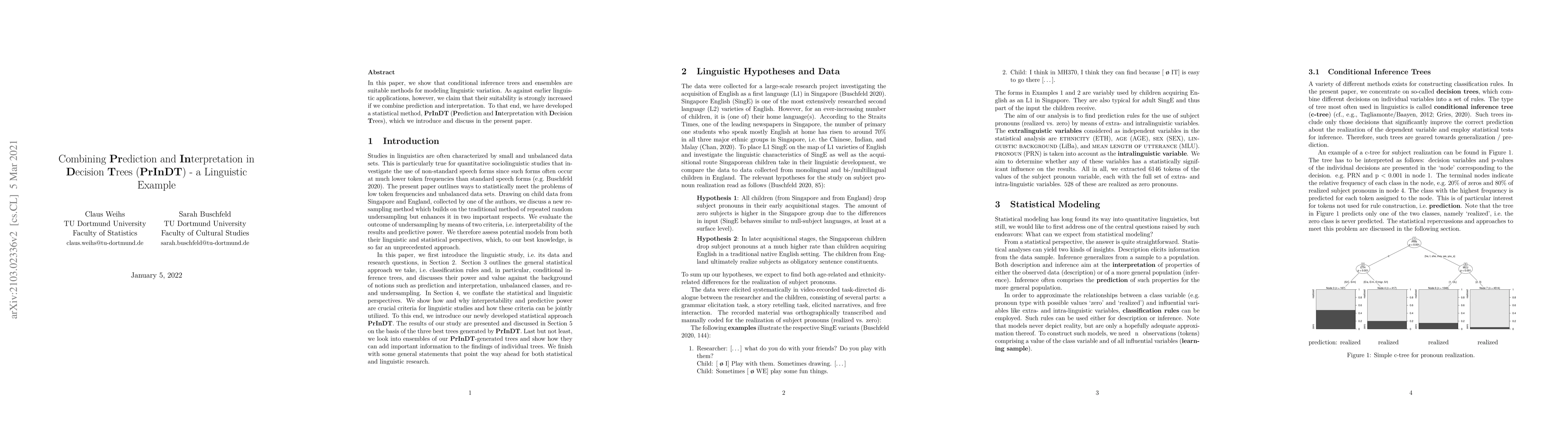This paper introduces PrInDT, a method combining prediction and interpretation in decision trees, to enhance modeling of linguistic variation. The authors argue that this approach significantly improves the suitability of conditional inference trees and ensembles for linguistic applications.