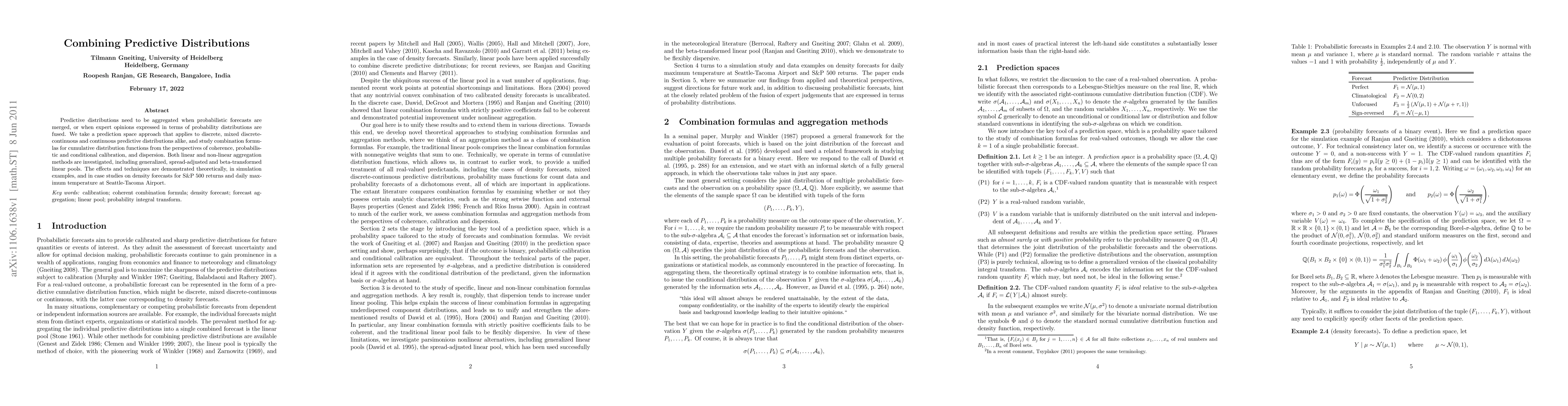 This paper investigates methods for combining predictive distributions from various sources to improve forecast accuracy, including linear and non-linear aggregation techniques, and demonstrates their effects on key metrics such as coherence and dispersion.
